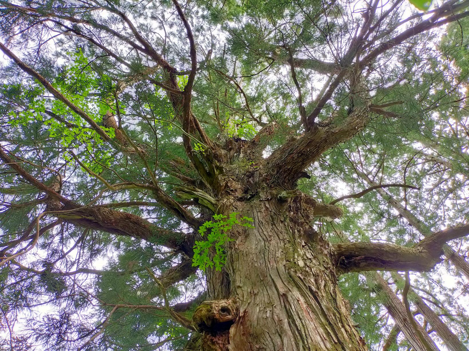 まず最初に見えてくるのは美女平の大きなタテヤマスギ。大きな幹に枝を広げてそびえ立つ様は、まさに森の巨人です。