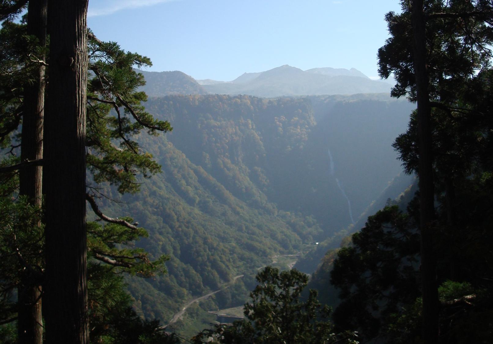 大観台では車窓から称名滝を見ることができます。木々の間から見える称名滝を含む、立山黒部アルペンルートが最初に見られる場所でもあります。