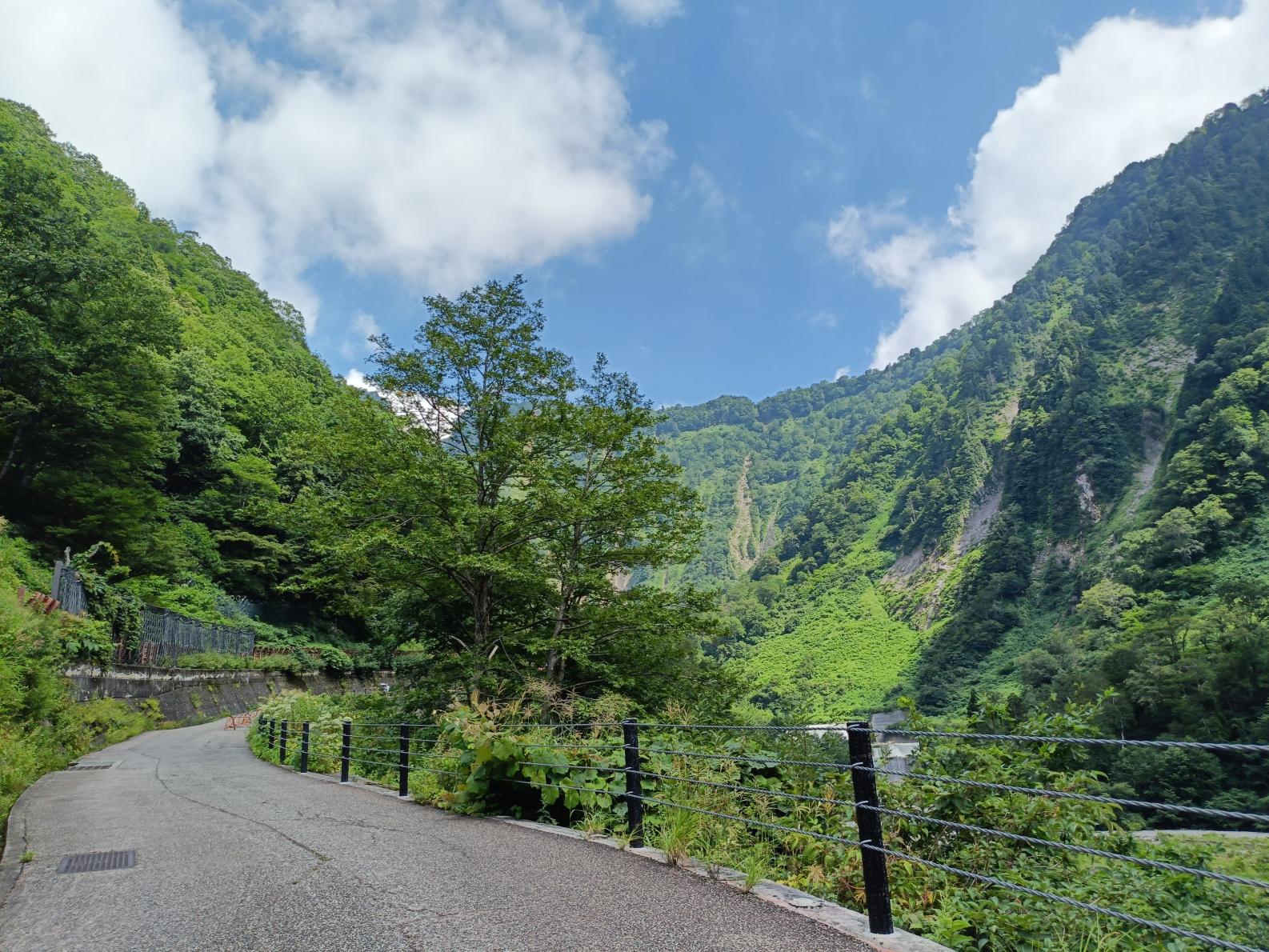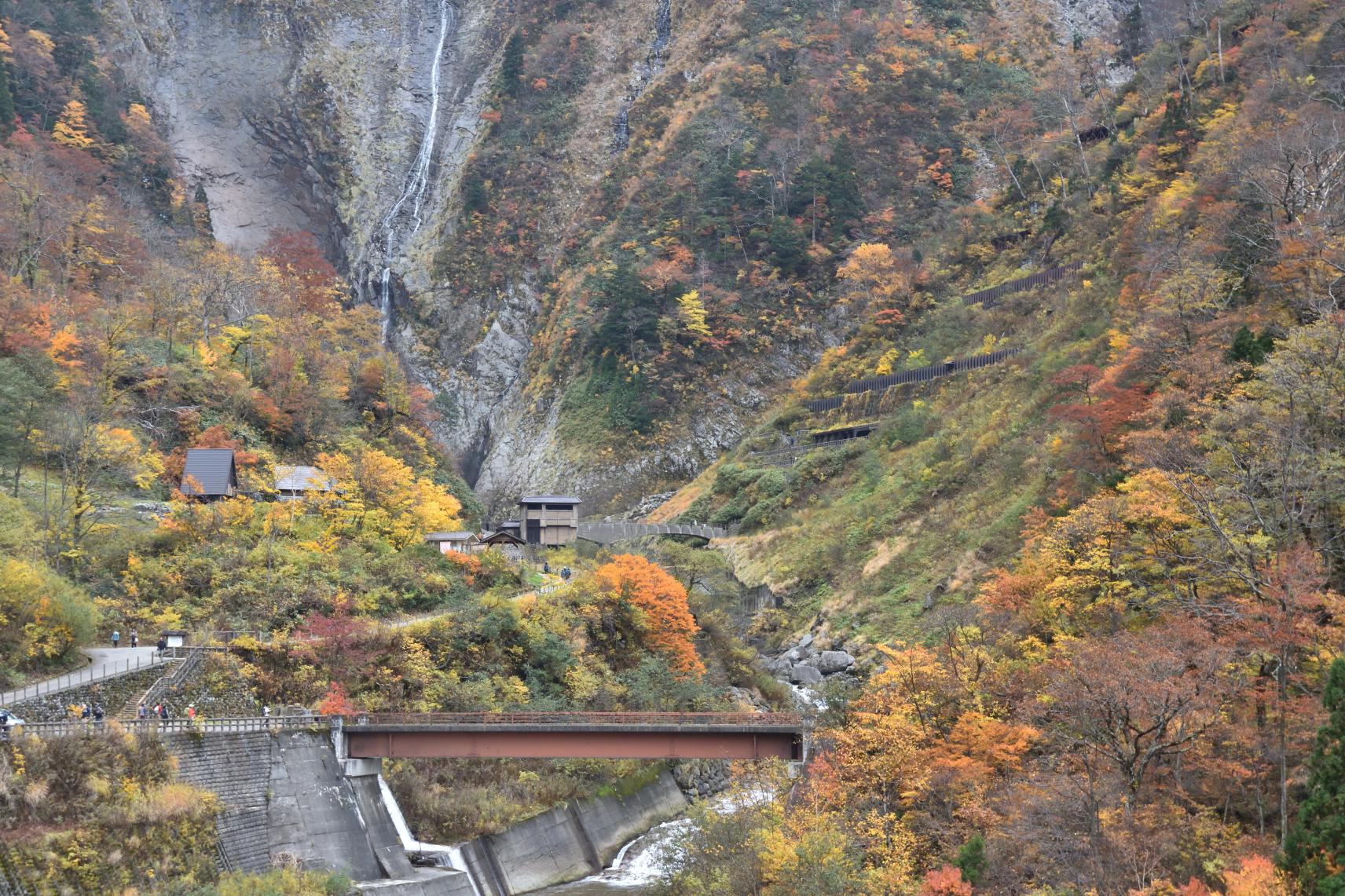 駐車場から滝までは約1.3㎞、徒歩で約30分程度です。道中は立山黒部アルペンルートの美しい景色を眺めながら、ゆっくり歩きましょう。称名滝の説明看板が立っている場所からは、滝のミストを感じることができます。そして「称名橋」の上では、滝のミストが全身に降りかかります。夏は天然のクーラー、とても気持ちいいですよ〜。滝周辺は標高1000m。秋の滝近くはとても涼しく(むしろ寒い場合も)なるので、上着があると安心です。