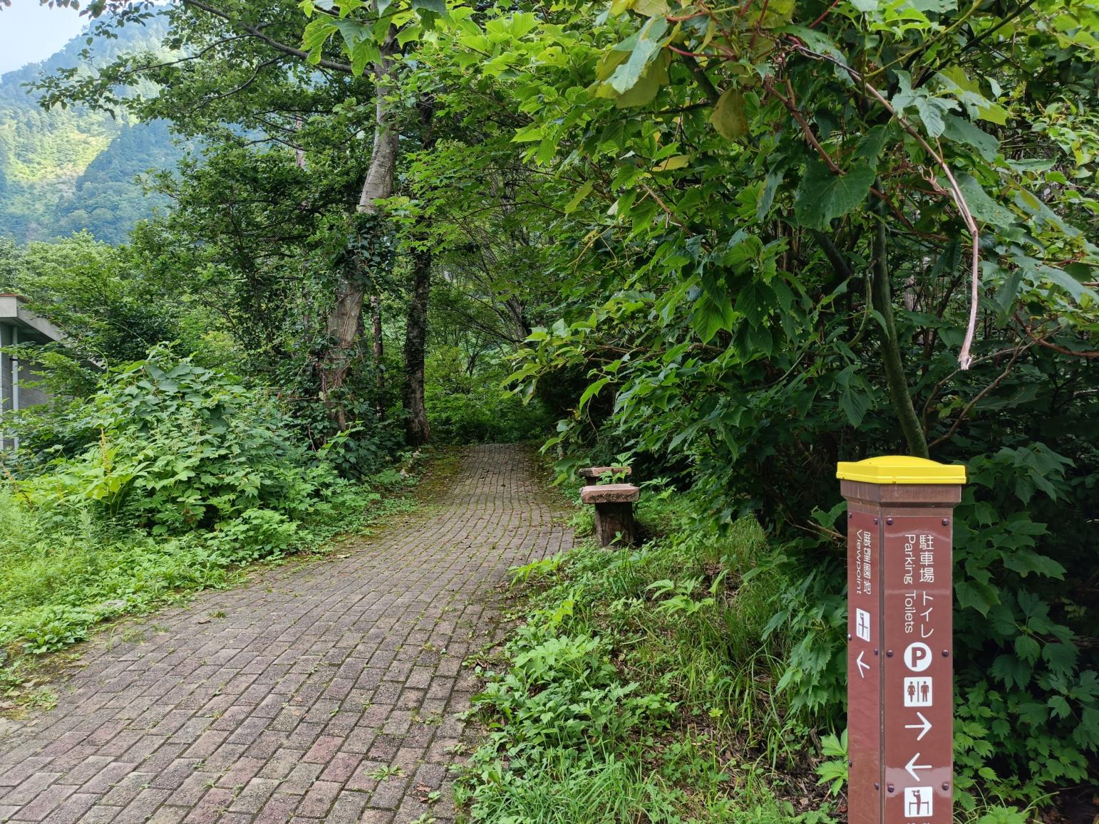 時間がなくて滝の前まで行けない時や、滝周辺で少しゆっくりしたい場合は、駐車場からすぐそばの「称名滝展望園地」がおすすめ。称名滝は少し遠いですが、滝を含めた立山黒部アルペンルートの雄大な景色を楽しめます。「レストハウス称名」の手前を右に折れて遊歩道を少し歩くとあります。