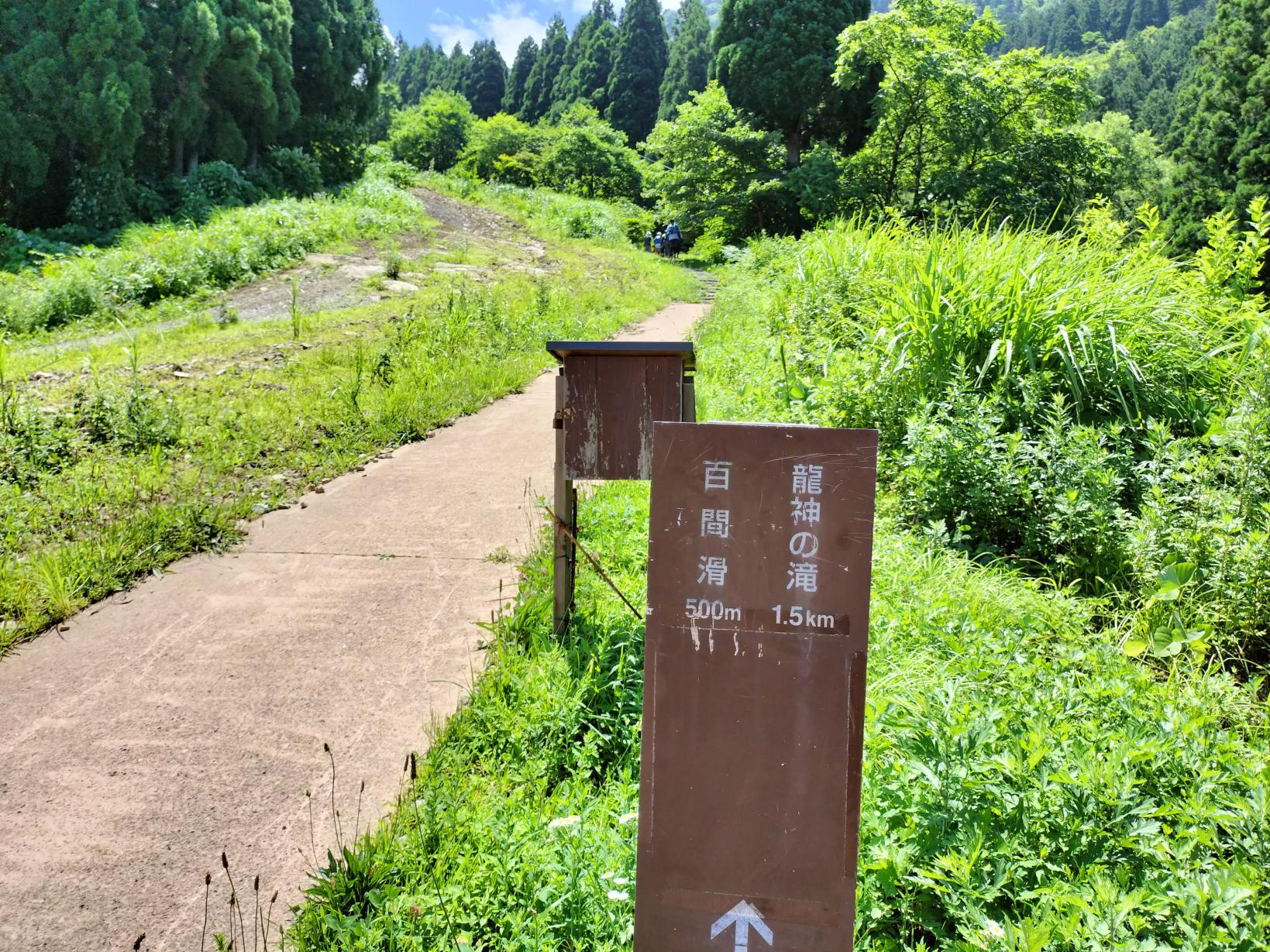 「百間滑」とは「龍神の滝」下流200メートル(百間)に渡って水が岩肌を流れていることから名付けられています。標高は約700メートル、水場ということもあり少しひんやりしています。私はいつもこの景色と水の音に癒やされています。看板近くにはトイレも整備されているので安心ですね。