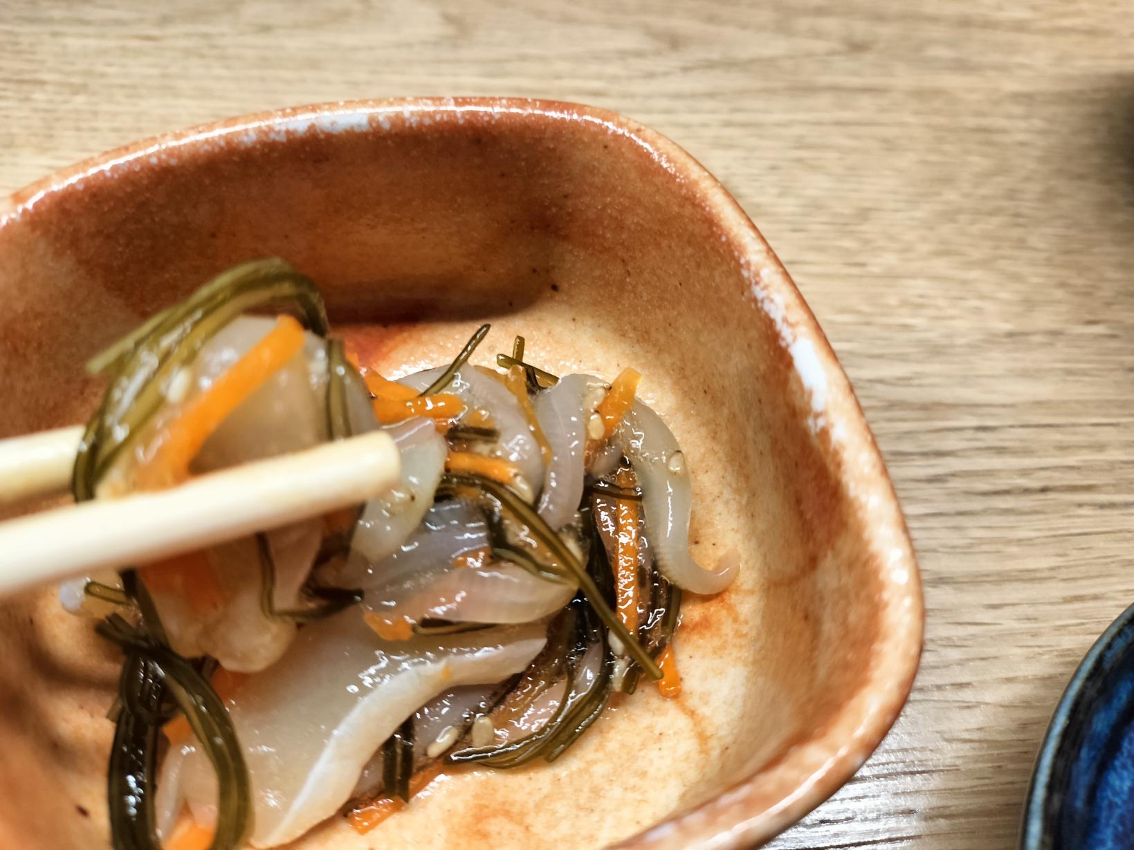 また「海富山」のガリは昆布とガリを組み合わせた「昆布ガリ」。昆布が入ることで普通のガリよりも味がまろやかです。ちなみに鮨の前に提供される小鉢は「松前漬け」で、メニューの随所に富山の昆布文化を感じました。