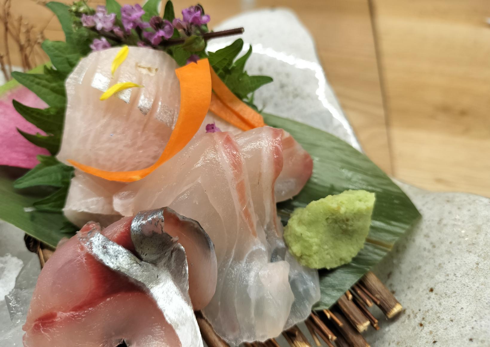 鮮度が命のお造りは、素材の良さがダイレクトに伝わります。この日は、かんぱちのトロ、真鯛、鯵の三種盛り。新鮮なお刺身は間違いない美味しさです。一緒に添えられるツマが鮮やかで食欲をそそります。