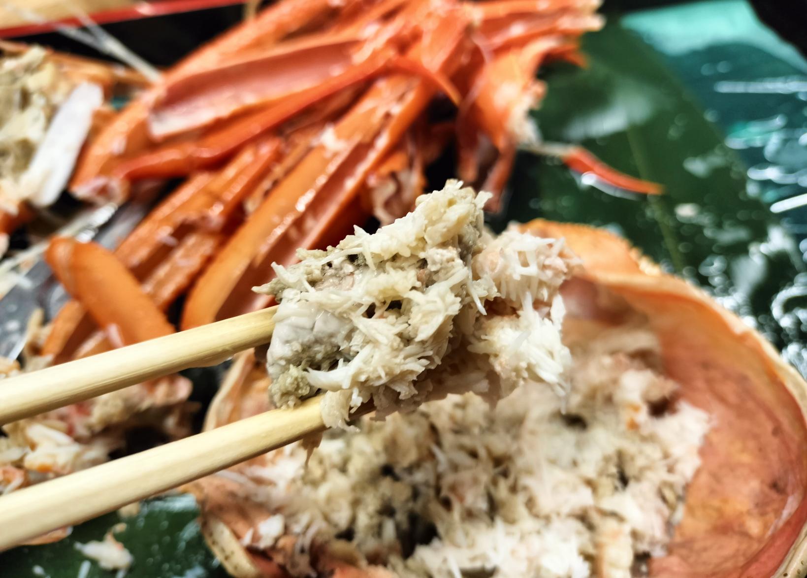 お待ちかねの蟹は大きな「紅ズワイガニ」がどーんと運ばれてきます。ハサミと手袋、カニスプーンを使いながら、身を取り出します。あれやこれやと身をほぐしながら食べるのも楽しい時間。説明書がついてくるので安心ですし、わからないところはスタッフが教えてくれるので心配はいりませんよ。