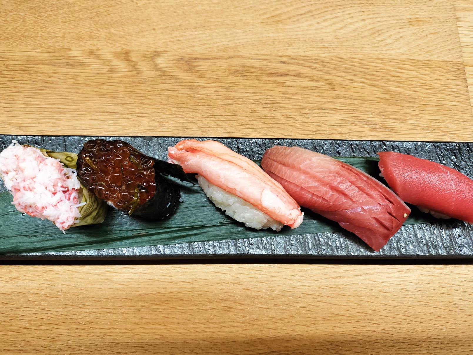 コース最後の料理はお鮨!中トロ、鰤(ぶり)、紅ズワイガニ、いくら、蟹バラ軍艦でした。富山の冬の2大海の幸である「鰤」と「紅ズワイガニ」を、今度は鮨でいただける幸せ。また、昆布多めのトロトロしたイクラの醤油漬けや、昆布を巻いた軍艦は、昆布の食文化が根付く富山ならではの味。昆布の旨味が食材の味を引き立てます。すべて最後まで美味しくいただきました!