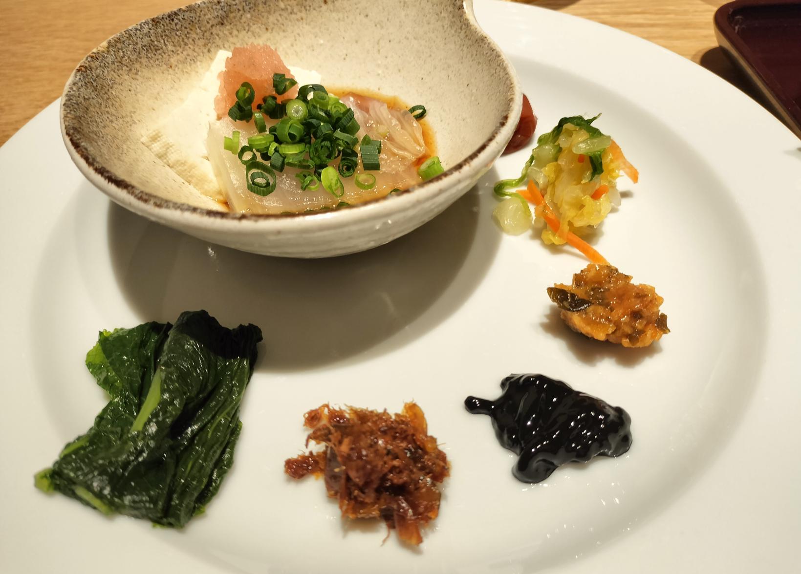 前菜では富山でおなじみの食材が味わえます。もずく酢や白子ぽん酢、ホタルイカ沖漬けなどの海の幸。白子はねっとりとしたなめらかな口当たりがたまりません。