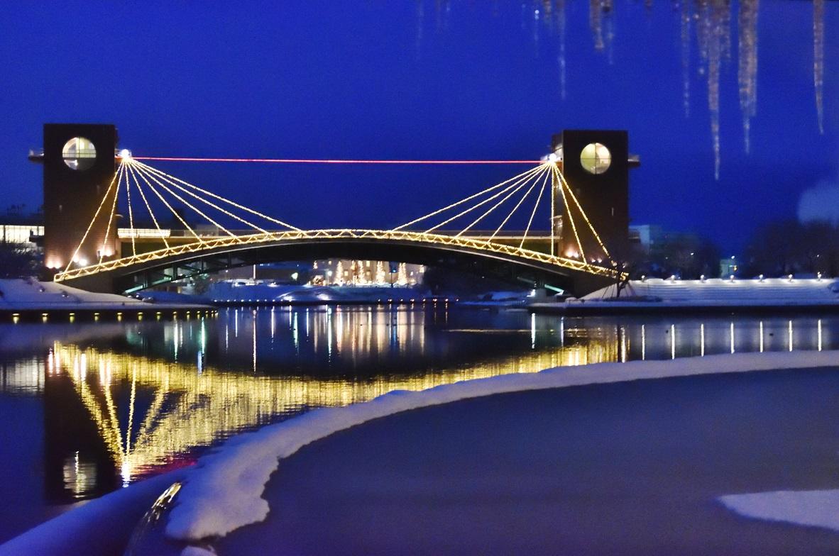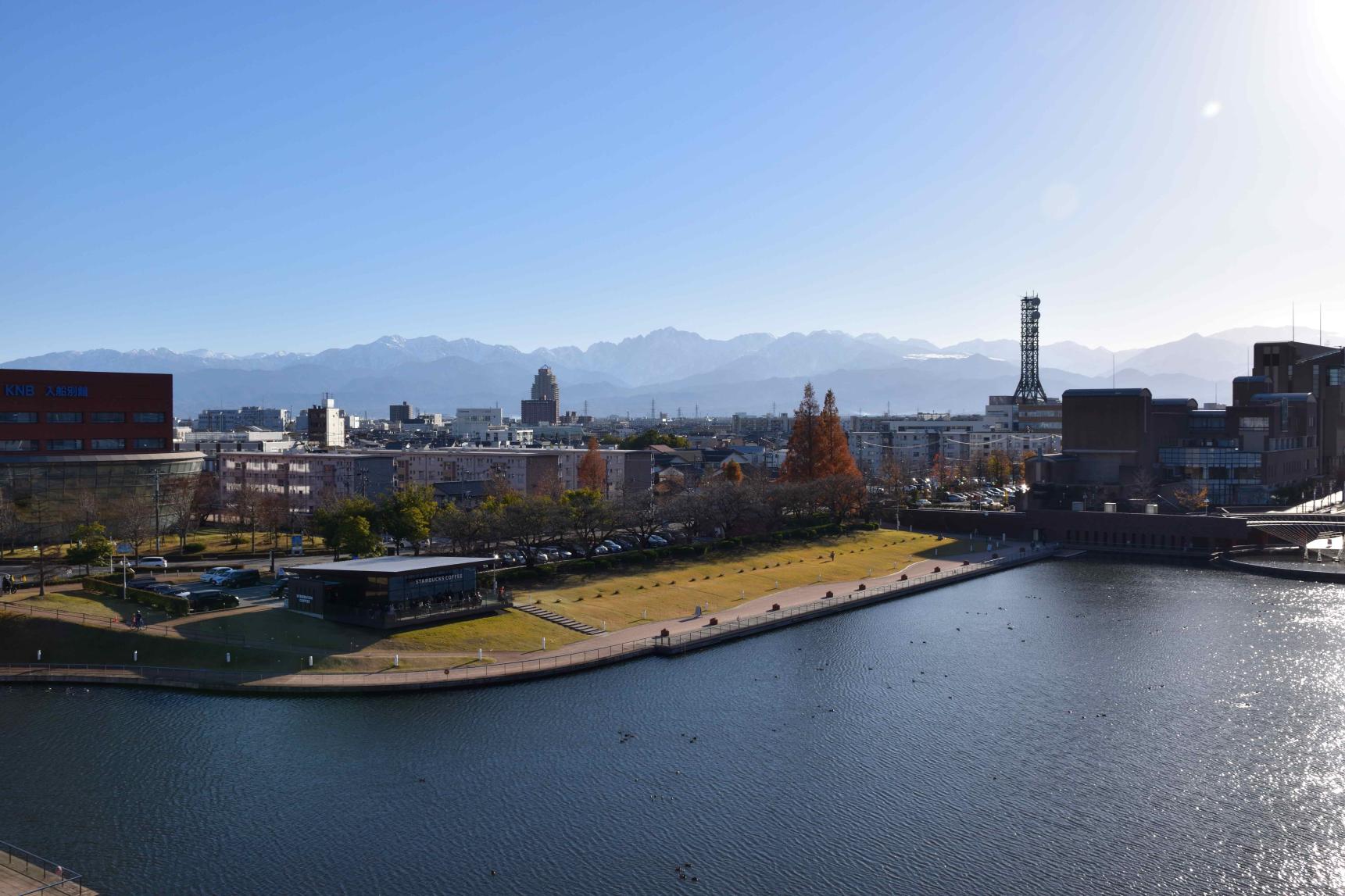 富山駅北口を抜けてブールバールを歩いていくと、「富岩運河環水公園」があります。天気がよければ、天門橋から立山連峰が一望できます。すぐ近くには「富山県美術館」。展示室以外は無料で利用でき、寒い時期の休憩にも便利です。カフェやミュージアムショップもありますよ。