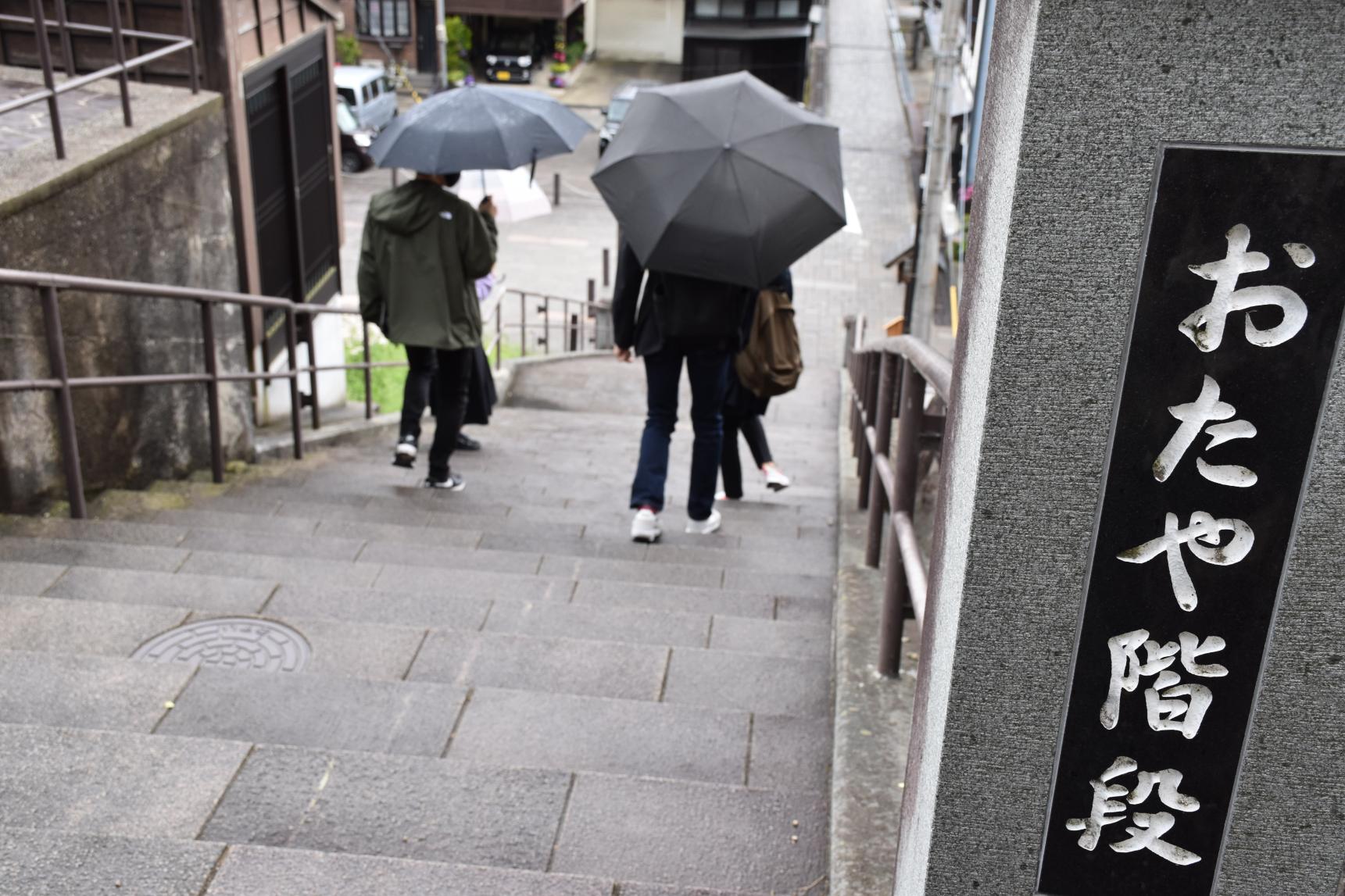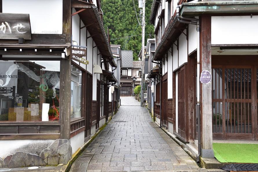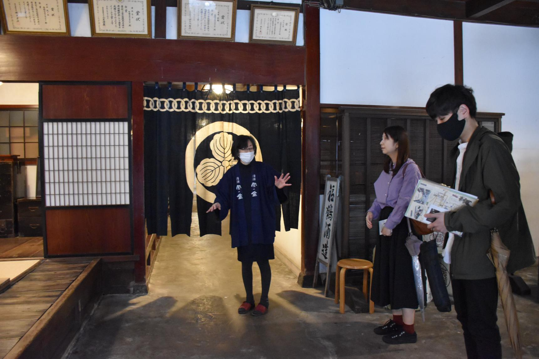 展示館を出発し、ガイドを聞きながらゆるっと町を歩きます。諏訪町本通りは日本の道100選に選ばれている美しい石畳の道。景観が良いだけでなく、豪雪地帯の知恵で道が綺麗に保たれる工夫がされています。