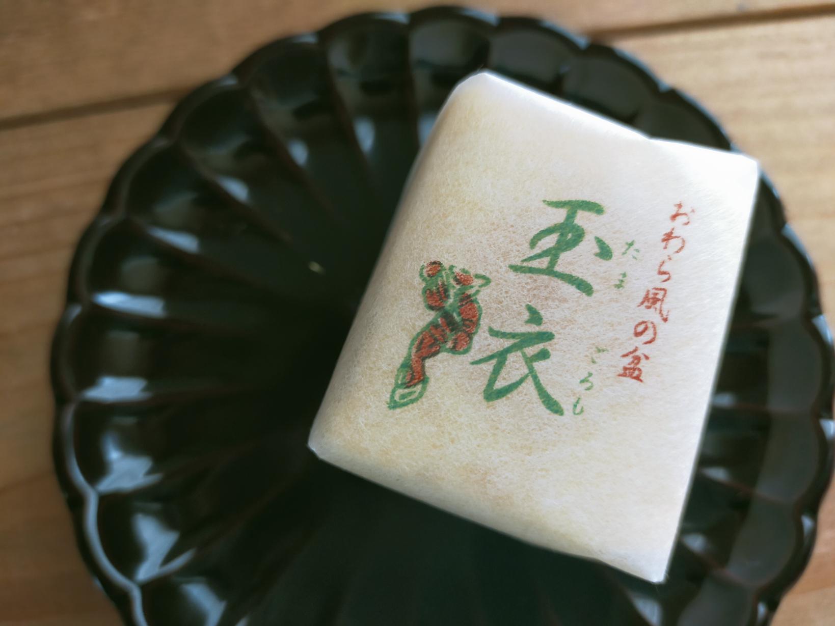上新町の「小蔵亀寿堂(こくらかめじゅどう)」ではおわらにちなんだ名前の和菓子や素朴な和菓子が並びます。好きなお菓子を一つ交換できます。私は「玉衣」にしました。おわらのイラストが越中八尾らしくていいですね〜。