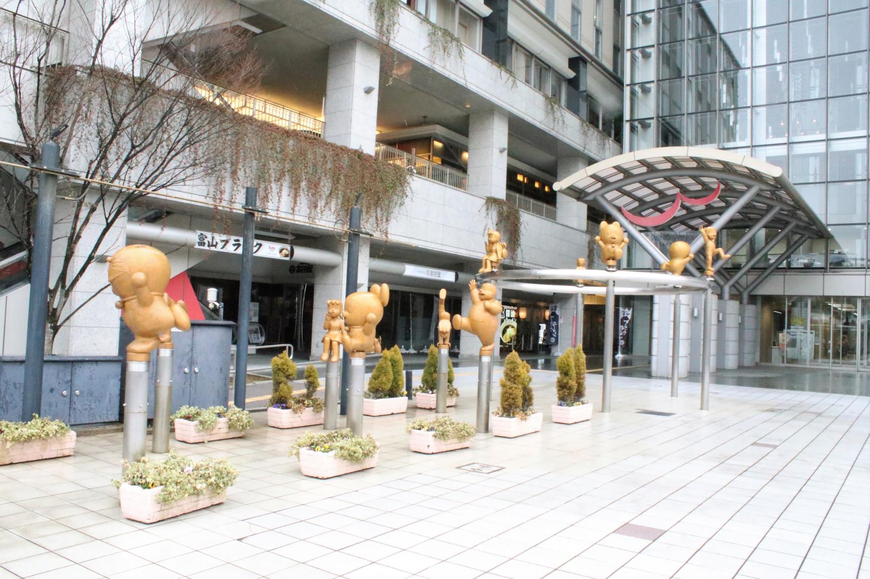 店舗があるのは、あいの風とやま鉄道「高岡」駅の古城公園口(北側)を出てすぐの場所にあるビル「ウイング・ウイング高岡」の一階。駅から1階に降りて信号を渡って行くか、階段を下りずに、通路を通って行くことができます。1階のドラえもんに登場するキャラクターの銅像が12体設置されている「ドラえもんの散歩道」という広場の奥にあるのでドラえもんを目印にして行くと、見つかります。