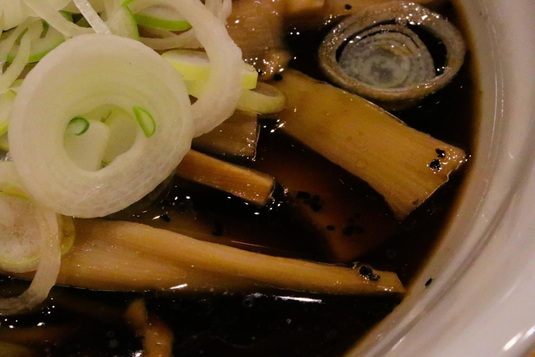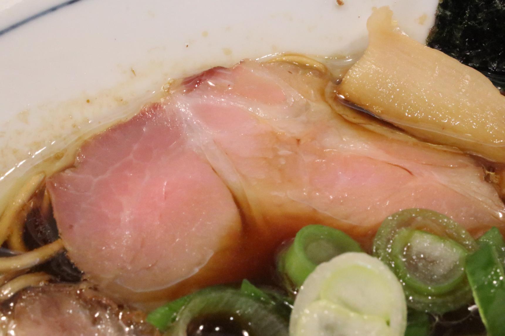 チャーシューは「飽きずに食べられるように」という店主の思いから、2種類入っています。写真の手前が豚バラのチャーシュー、奥のピンク色のほうが豚肩ロースを低温調理して仕上げたレアチャーシューです。個人的なお気に入りは、アクセントとして入っている紫玉ねぎのみじん切りです。「切り方を工夫している」とのことで、まったく辛くなく、むしろ甘みを感じました。