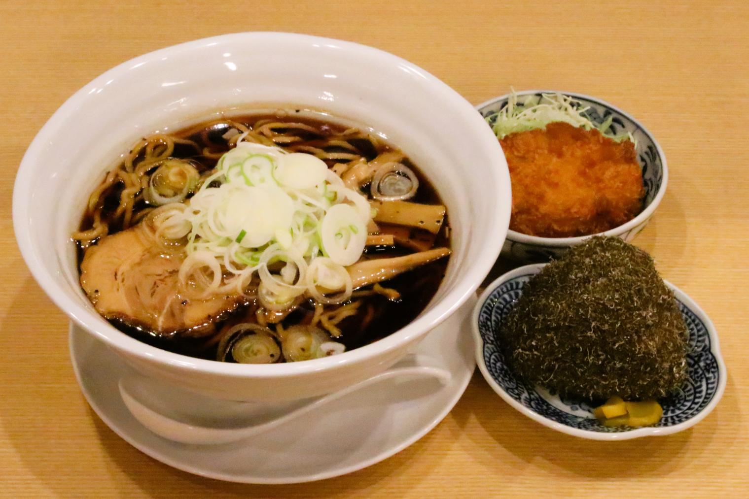 注文したのは、富山名物を一度に楽しめる「ご当地ぐるめセット」。「富山ブラック(黒醤油ラーメン)」 、高岡名物コロッケ、とろろ昆布おにぎりのセットです。「黒醤油ラーメン」は、注文時に薄めも選べるようになってます。今回は白ごはんを注文しなかったので、店員さんおすすめの「薄め」をお願いしました。