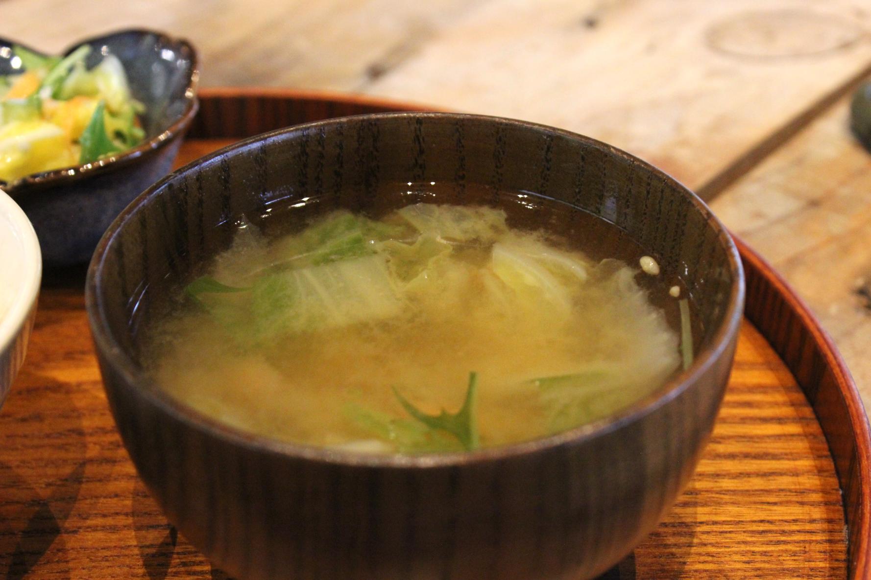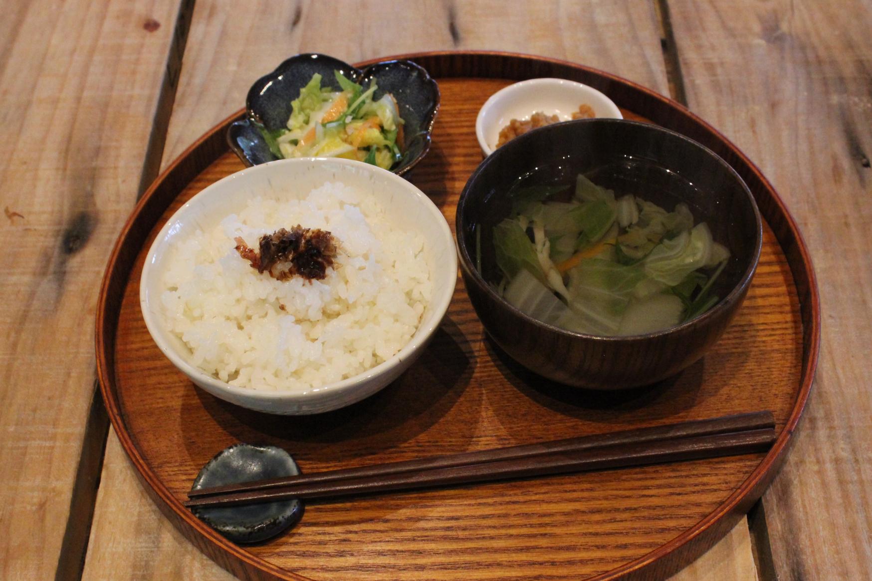 今回いただいた「RICE & MISO SOUP SET」は、味噌汁に入れる味噌が選べるスタイルでした。小皿にのった味噌を、自分で溶いて味噌汁を仕上げます。今回は、「純正」を選びました。たっぷりの旬の野菜、しみじみとおいしい味噌の味に、食べているそばから心身ともに癒されていきました。