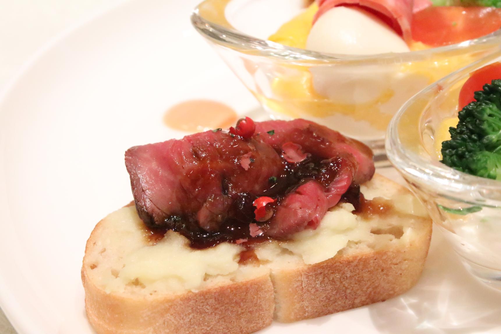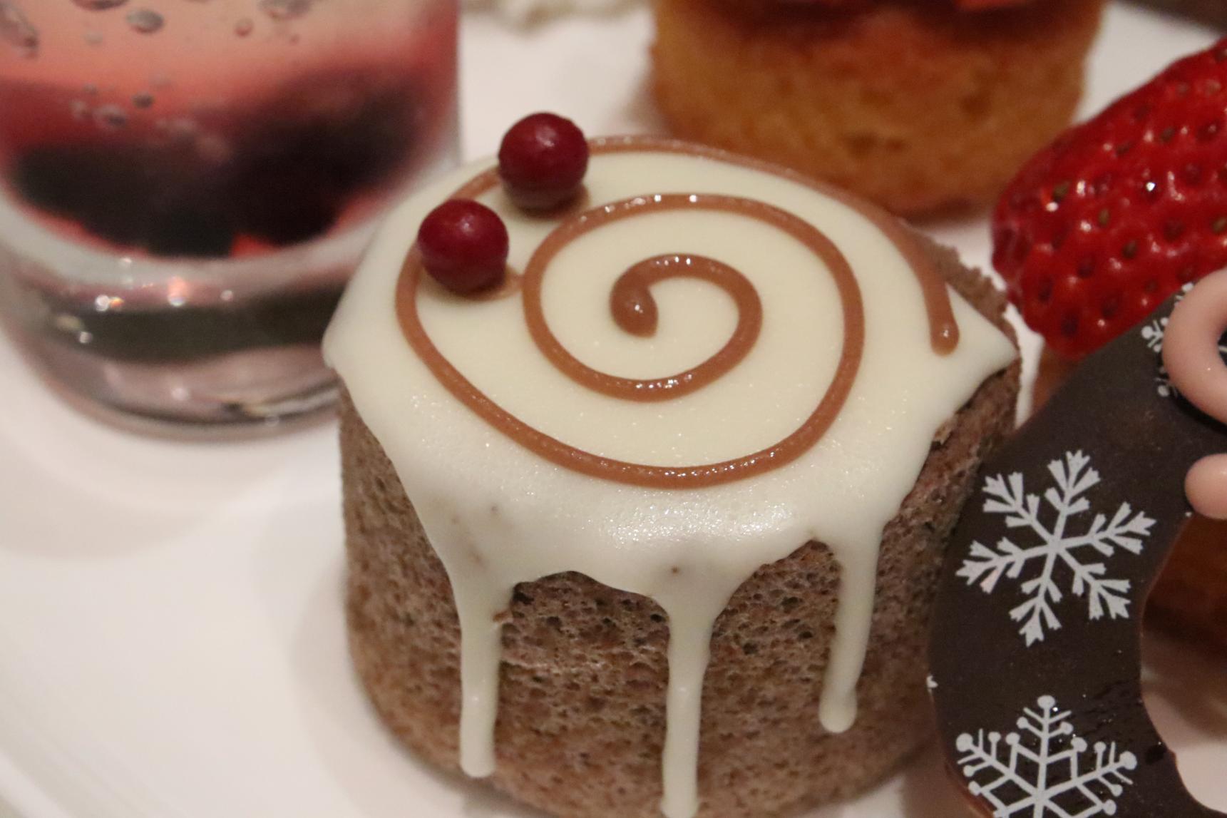 当日私は昼食なしで臨んだので、最初は3段目の「3rd-12/25stage」を中心にいただきました。こちらのテーマはクリスマス当日の12月25日。お食事としても美味しくいただける品が揃っていました。特に「ローストビーフのタルティーヌ」は柔らかいお肉の良さを、マッシュドポテトとバケットが引き立てており、アフタヌーンティーの世界への入り口にぴったりでした。卵も乗った「サンタ帽子風ポテトサラダ」と「チキンフリットピンチョス」も食べやすいサイズで、とてもおいしかったです。