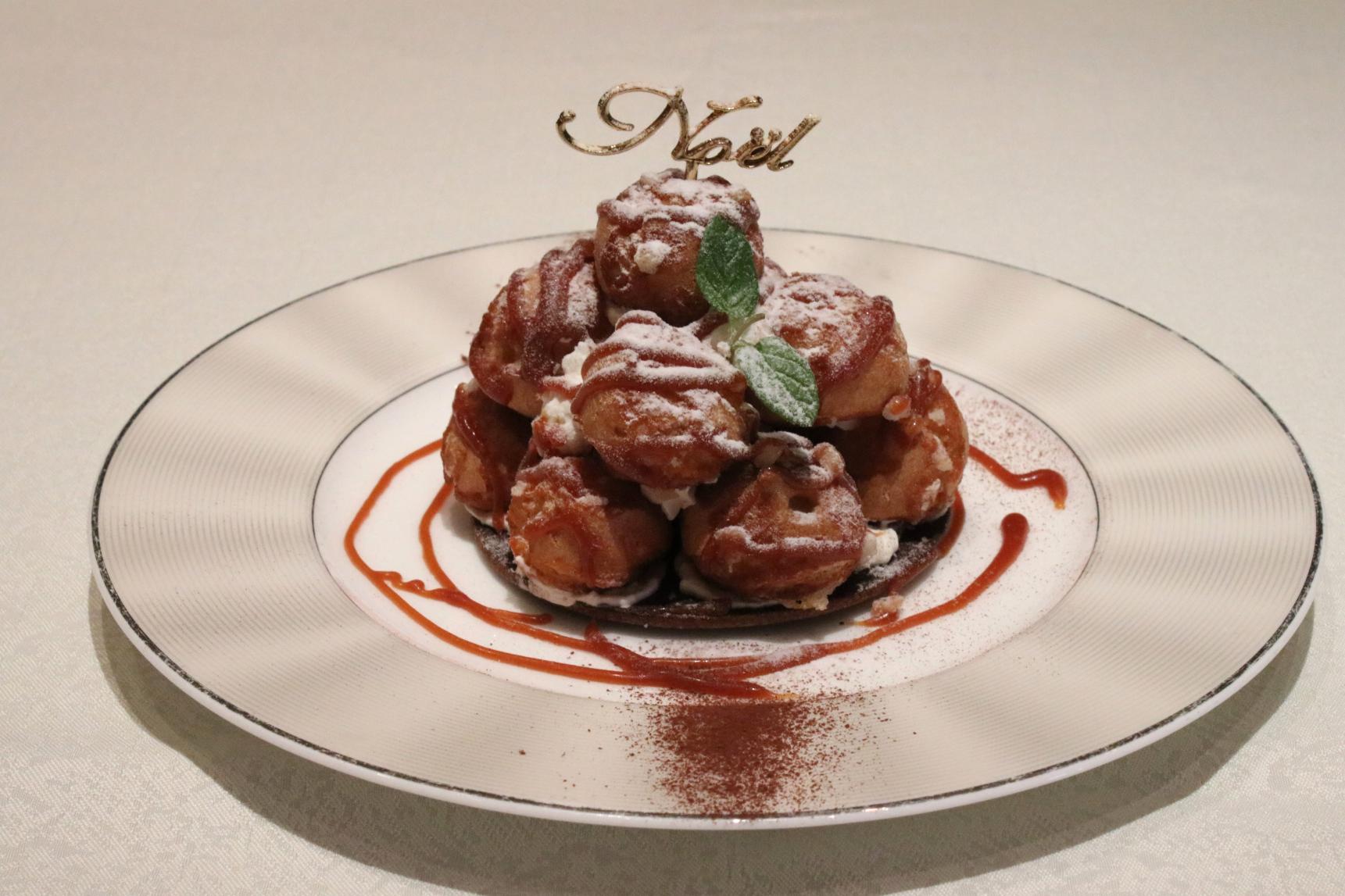 アフタヌーンティーのワゴンの横に置かれたのは、美しい「クロカンブッシュのツリー」です。下のチョコがけサブレ、キャラメルがけのシュークリームがどちらも軽い食感で、食べやすかったです。