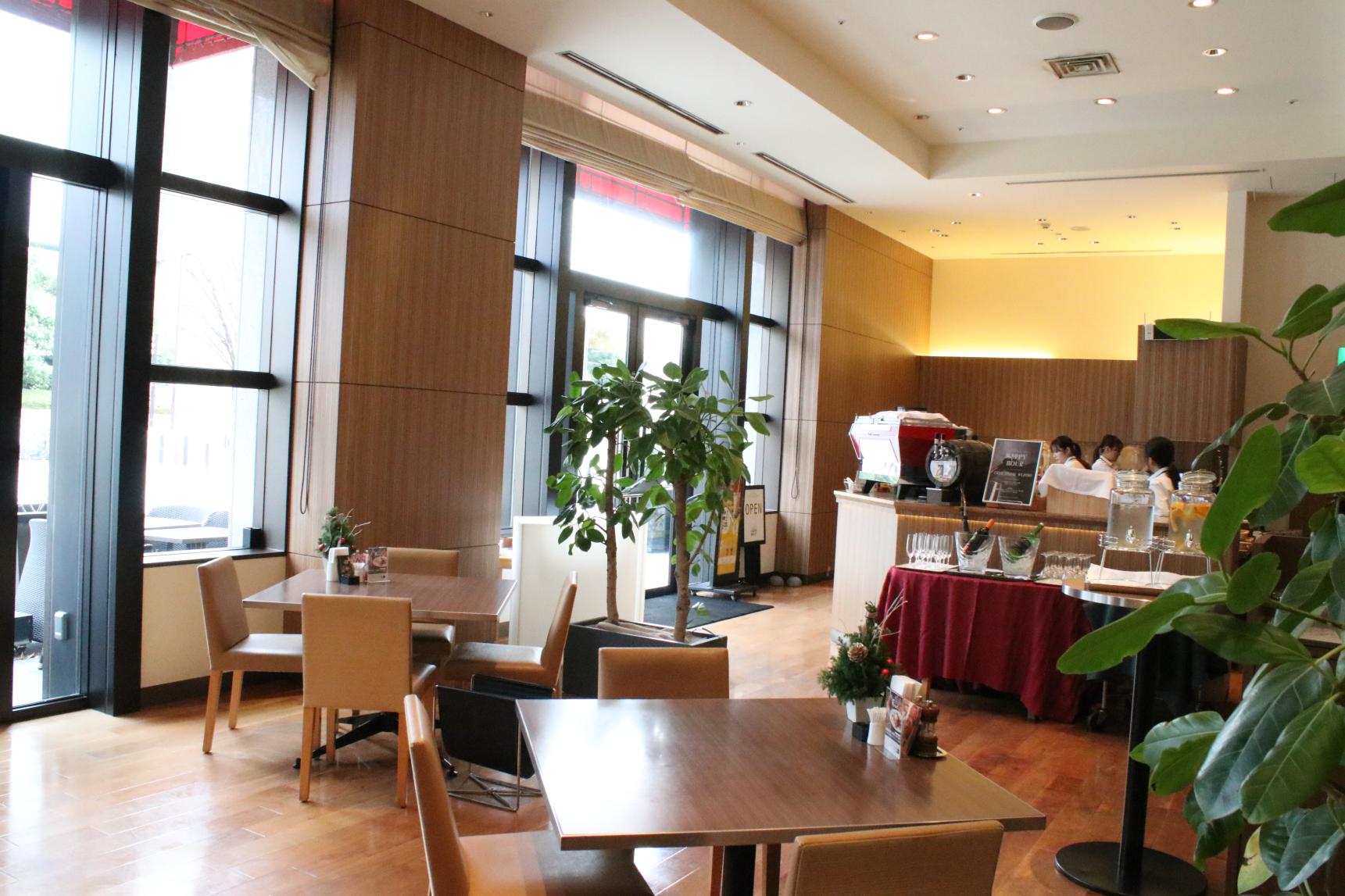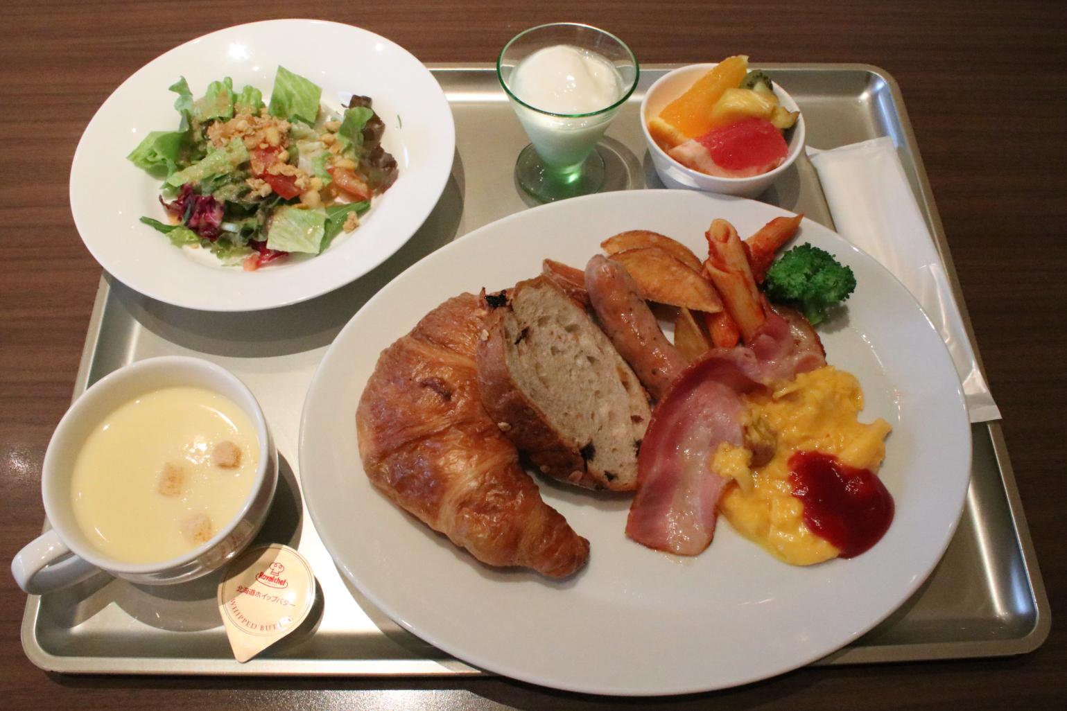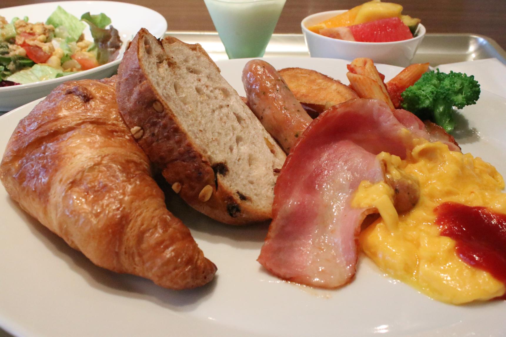 朝は「ユーロカフェ・エヴー」で和洋から選べる朝食セットをいただきました。私は洋朝食を選択。サクサクのクロワッサン、くるみとドライフルーツ入りのパン、トロトロのスクランブルエッグ、ハーブ入りのソーセージ、表面がカリカリのポテトや新鮮なサラダ、フルーツ……。すべてがおいしかったです。通りの風景をのんびり眺めながらいただく時間は、至福のひとときでした。飲み物は、ドリンクバーでみかんジュースや紅茶、コーヒーをいただきました。