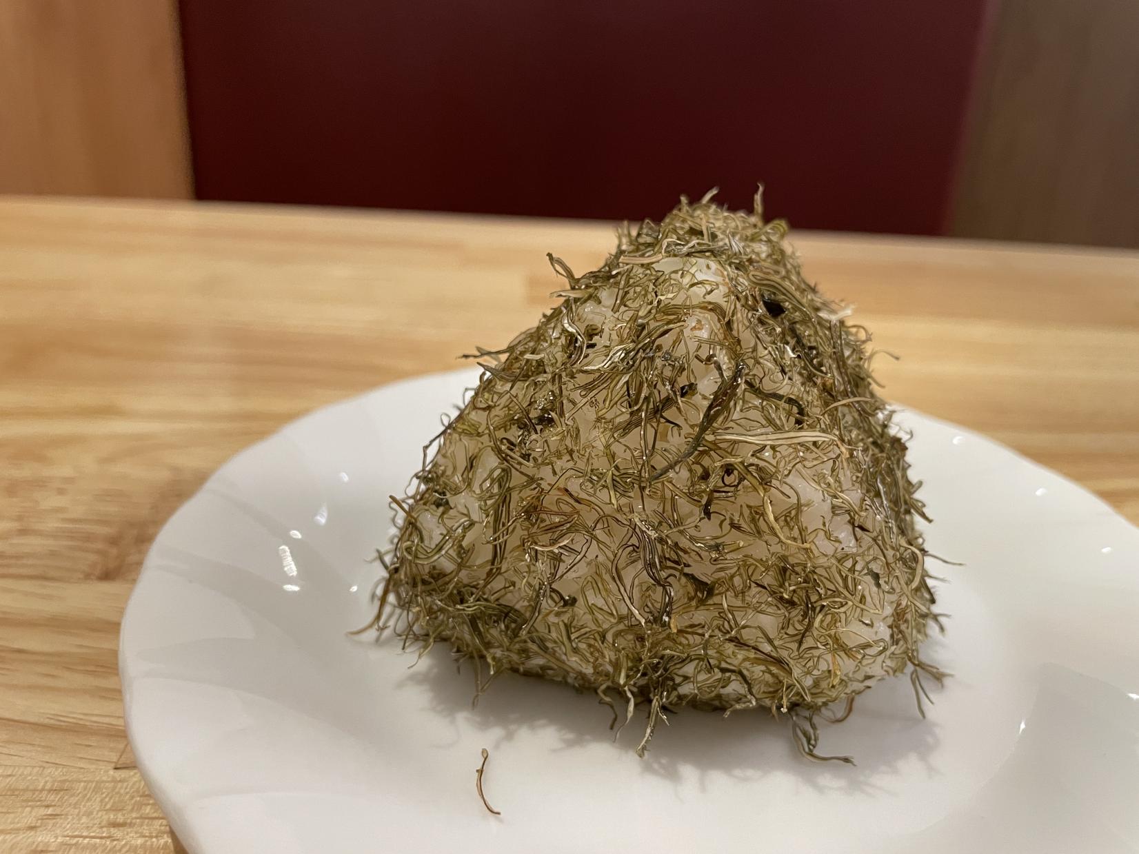 続いて、メニューにあったおにぎりを注文。これはお酒を頼んだ人しか注文できない限定メニュー。出てきたのは、とろろ昆布をまぶした富山ならではのおにぎり!