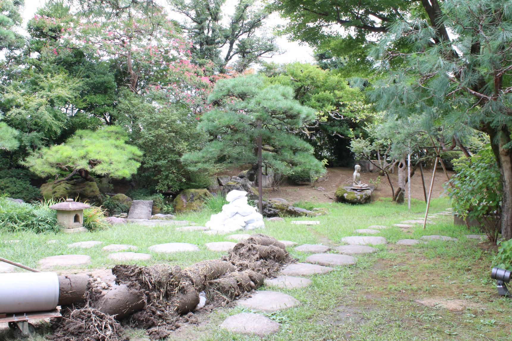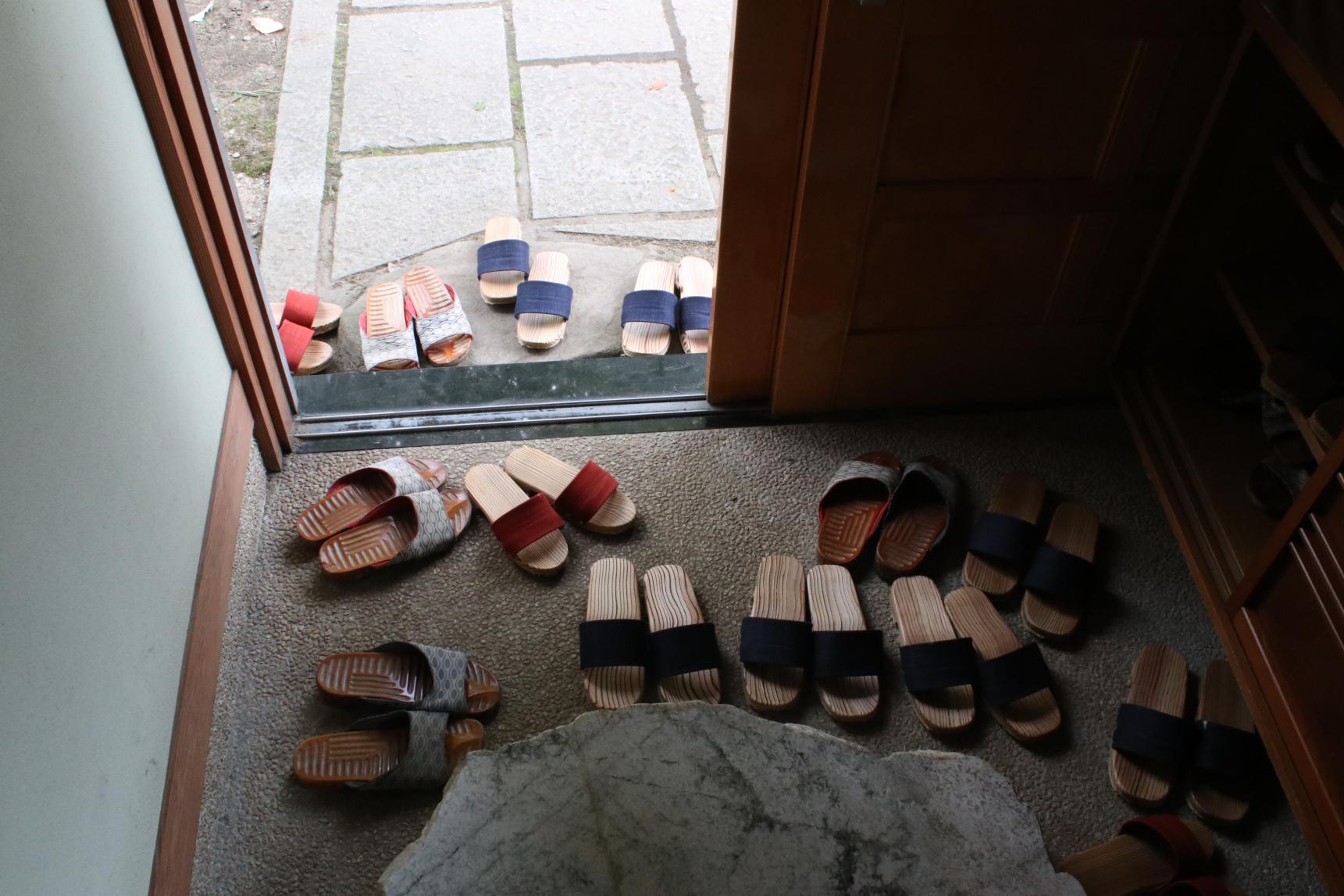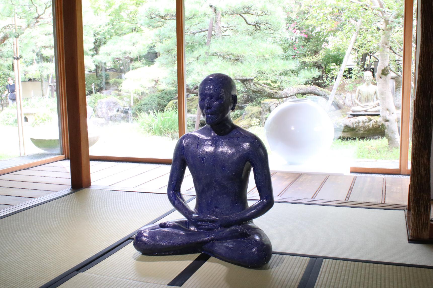 下駄を履いて美しい日本庭園に入ると、その先に富山の工事がテーマの作品や、建物内から続く坐禅のアートなどが置かれています。