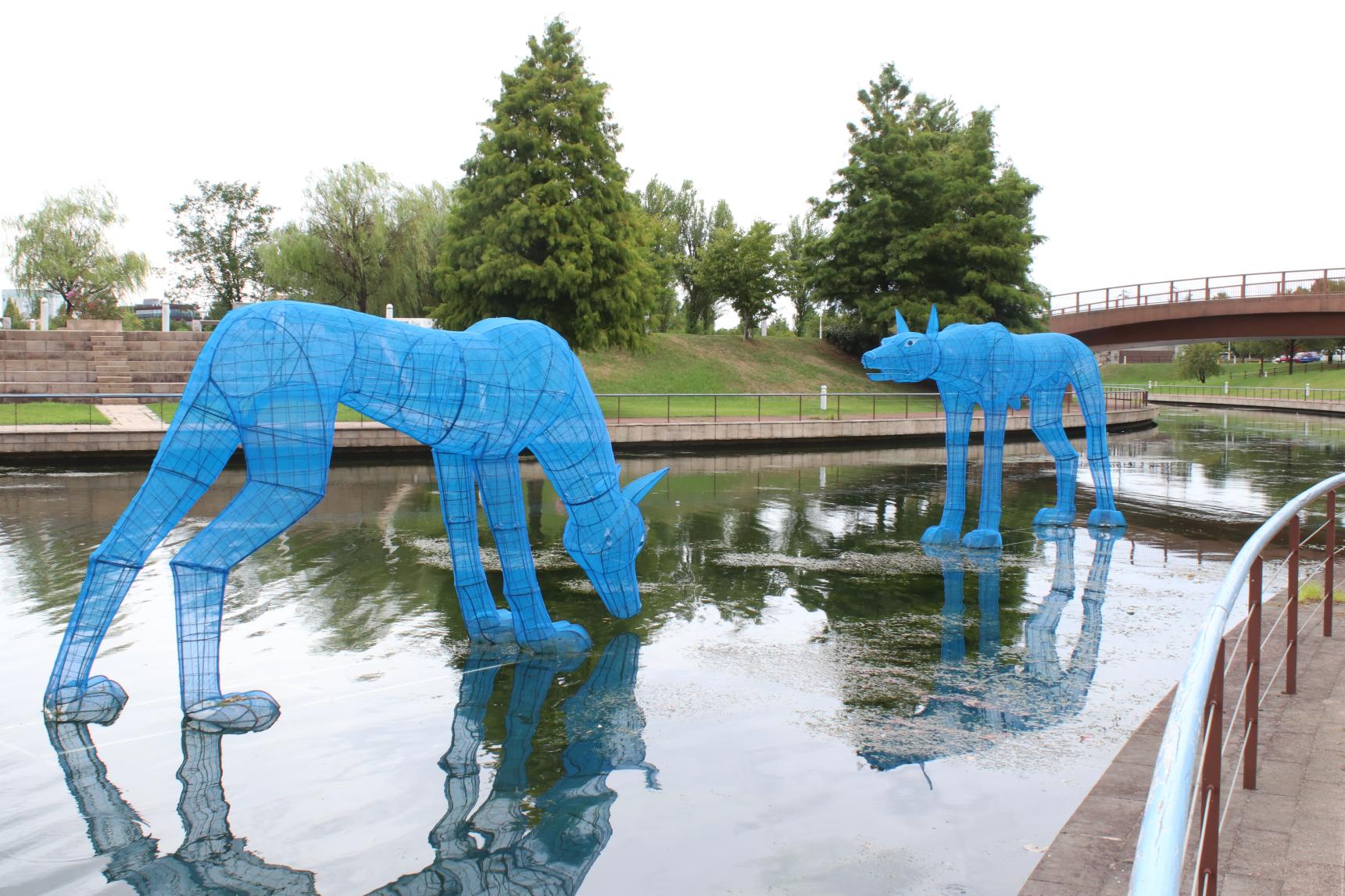 樂翠亭美術館から徒歩約8分のところにある富岩運河環水公園内の運河には「やまいぬ」という巨大なアートが!