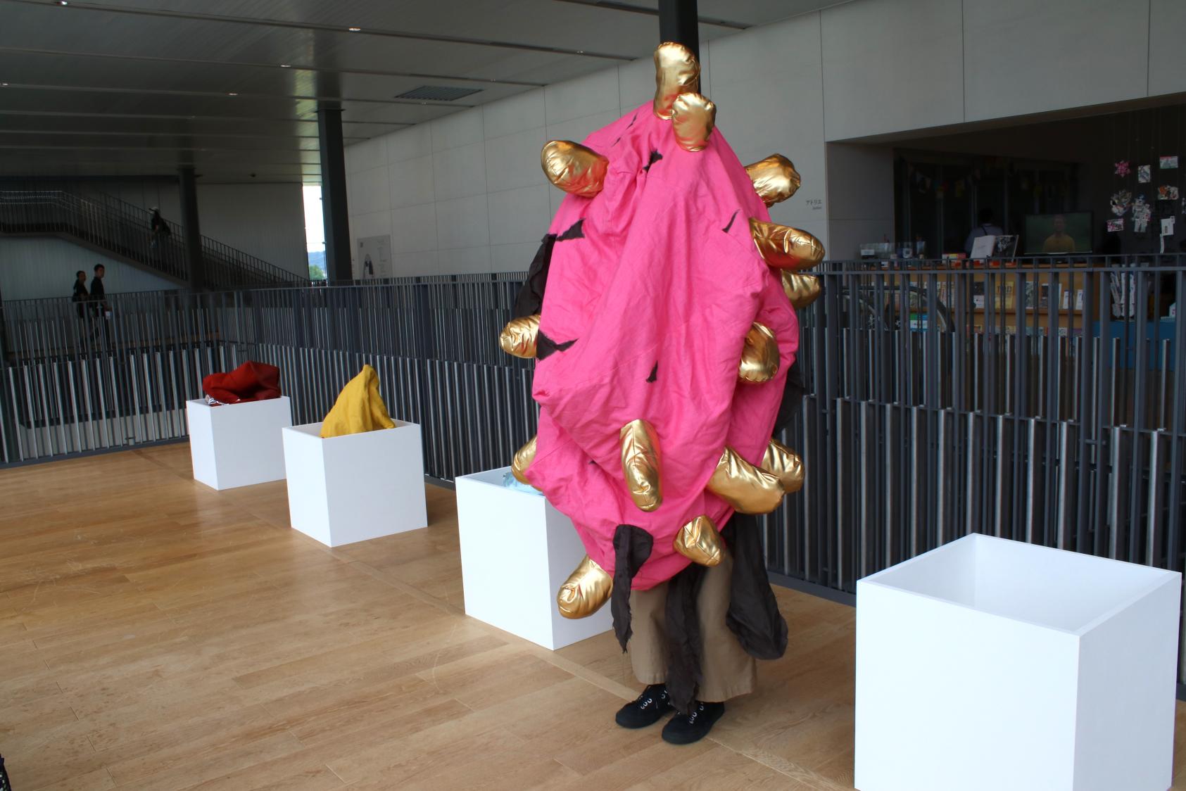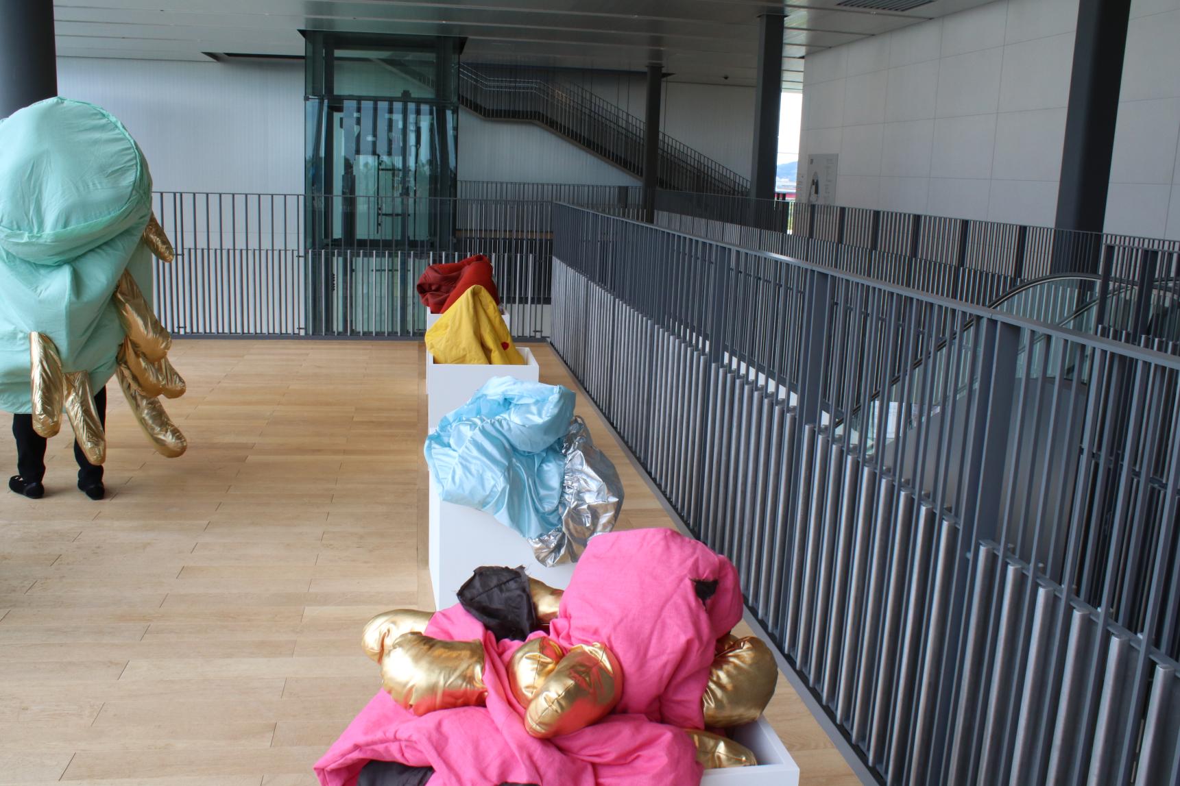 環水公園の中を約10分歩いたところにある「富山県美術館」の2階に展示されているのは、自由に触り、自分で被ることもできる布の作品です。作品を手がけたフランス出身のオードリー・ガンビエさんはクラシックバレエを学んだ経験のあるアーティストで、見た人が身に付けて動くところまで含めて味わってほしい作品だとのことです。