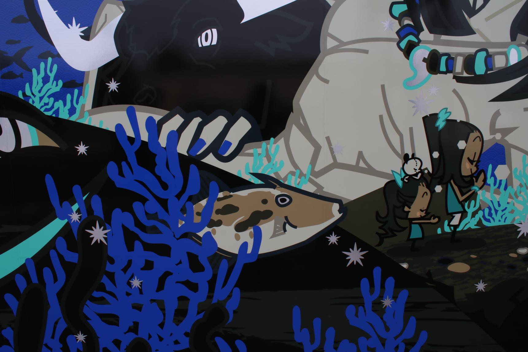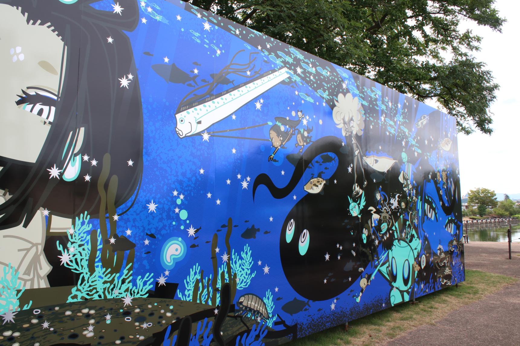 芝生エリアにあるのは、ゲームや出版、広告やアパレルなど多様な分野で活躍中のアーティスト、上田バロンさんがアクリルで描いた大きな絵巻です。富山に由来する生き物がたくさん入っていて、想像力をかき立てられました。小さな子どもから大人まで一緒に楽しめそうな作品です。