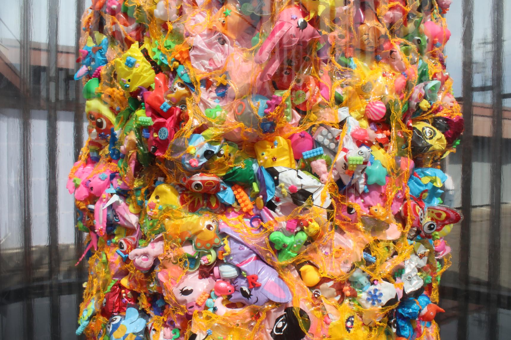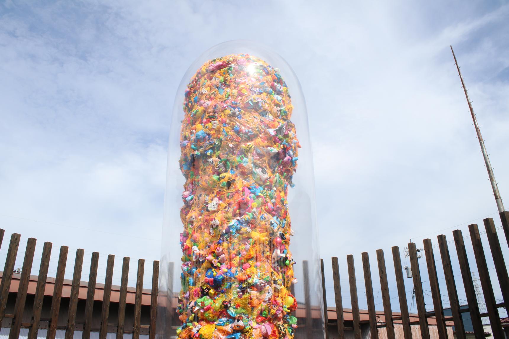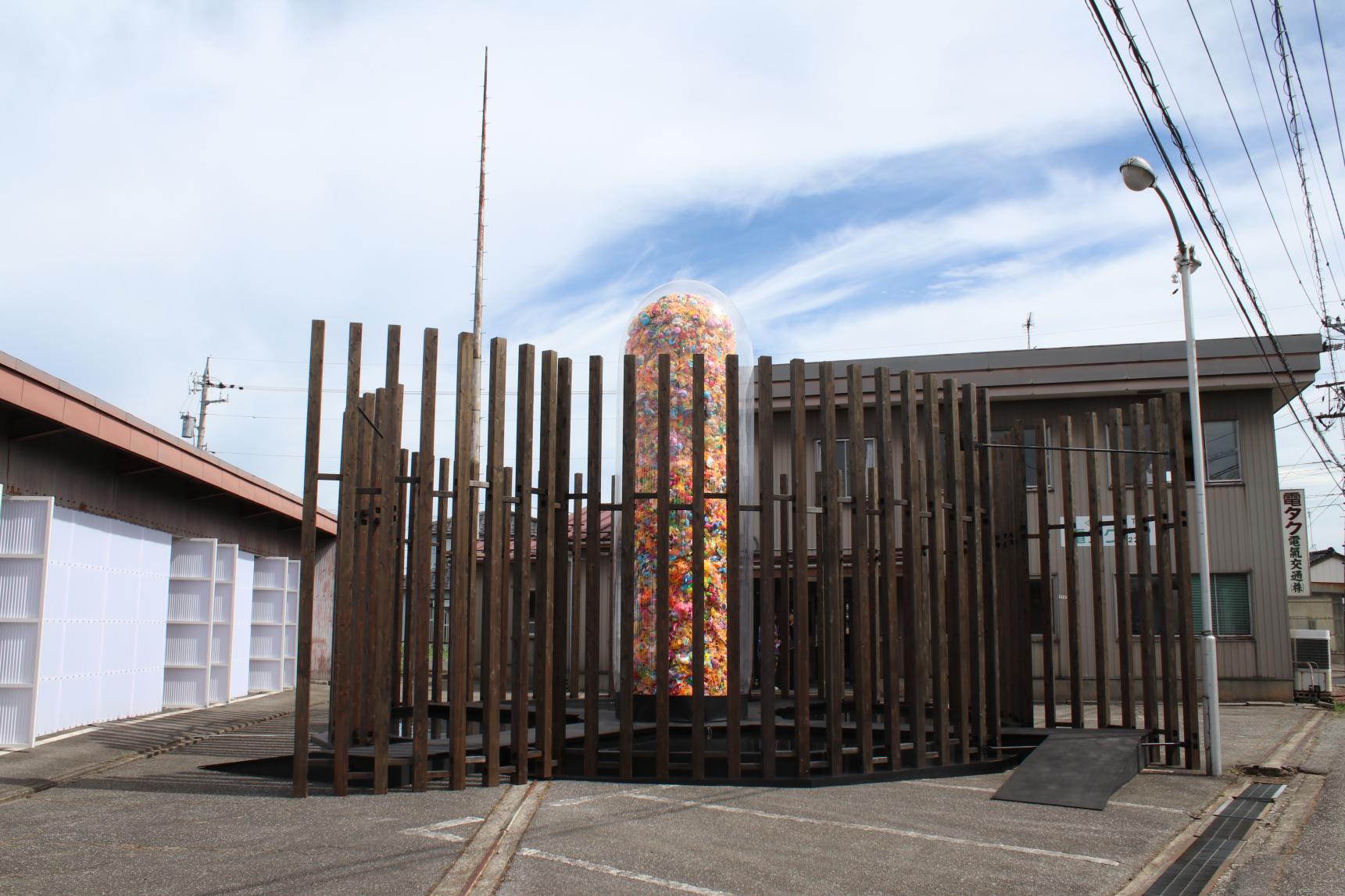 芝生エリアから徒歩1分ほどの場所にある「電タク」の入り口には、日本発の「KAWAII(カワイイ)カルチャー」の第一人者、かつ世界に広めたアーティストとして知られる増田セバスチャンさんによる作品「Polychromatic Skin -Gender Tower- #北陸」があります。おもちゃを中心とした世界中の素材を使って絵の具を使わずにカラフルさを表現し、多様性を伝えようとしているそうです。風に揺れるタワーを見ながら、世界に思いをはせました。
