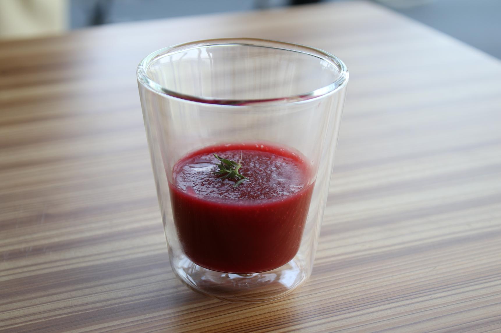ランチのテーマは、五感で感じる、身体が喜ぶ “TOYAMA Wellness Cuisine”です。最初にいただいたクレンズジュースは、これからいただくランチの「吸収を高める」ことを目的としています。今回のクレンズジュースはビーツ、オレンジ、タイム、シナモン入りで、初めての組み合わせでしたが、春の訪れを感じさせられる爽やかさを備えた、心に染みわたる風味でした。香りが心地よかったです。