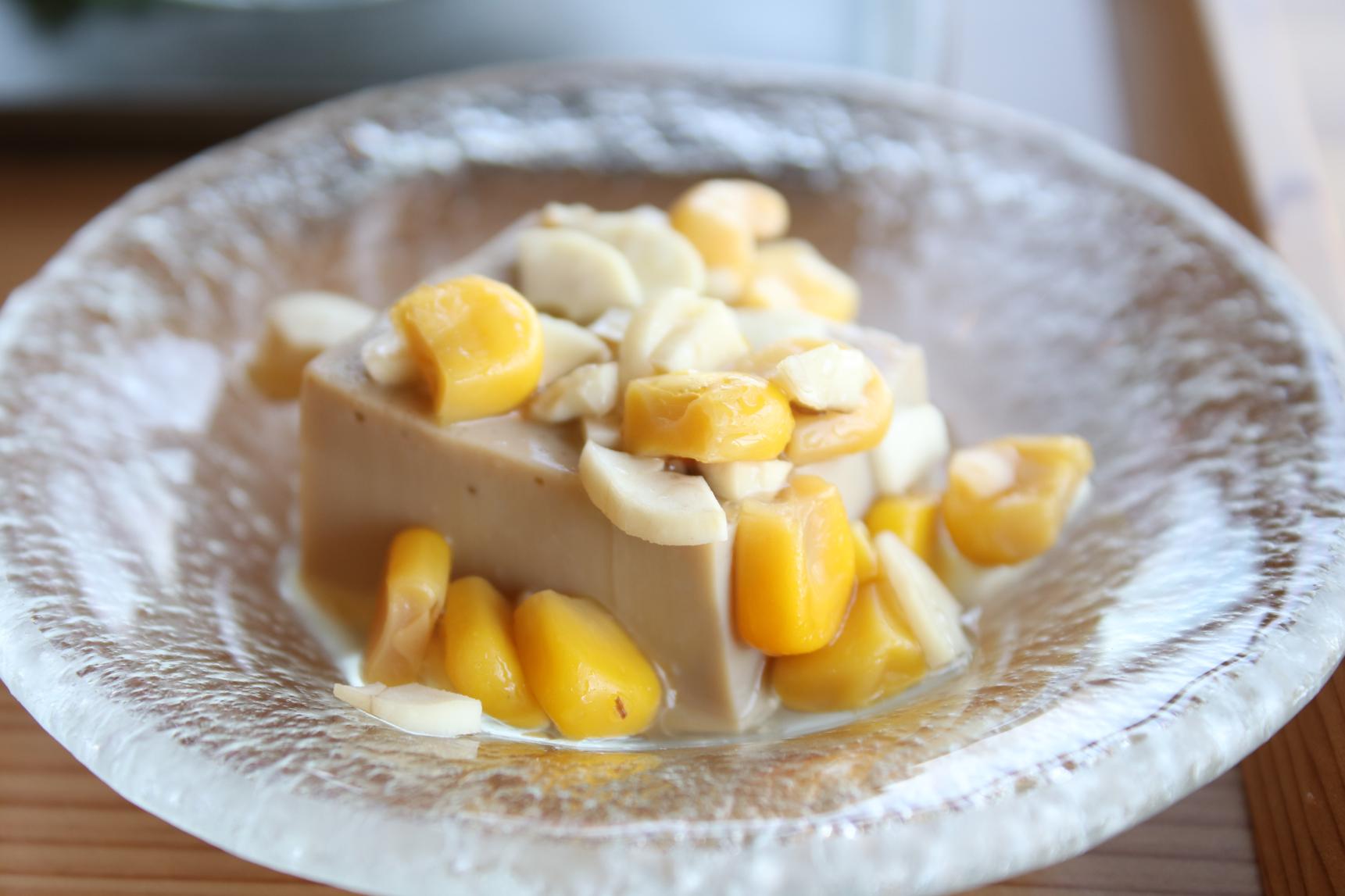 玉子豆腐のうえに、トウモロコシと細かく砕かれた蓮の実がのっています。蓮の実を食べたのはおそらく初めてだと思うのですが、香ばしさが絶妙で、あとを引く味わいでした。