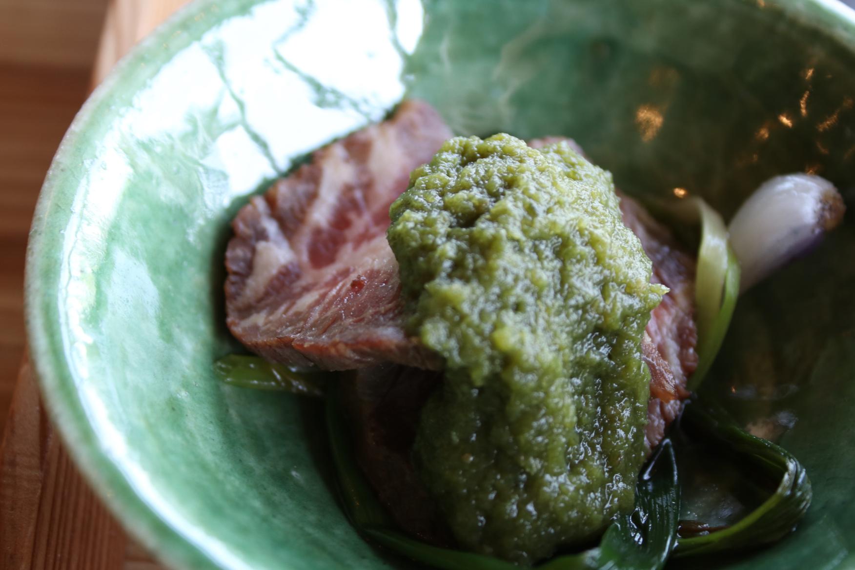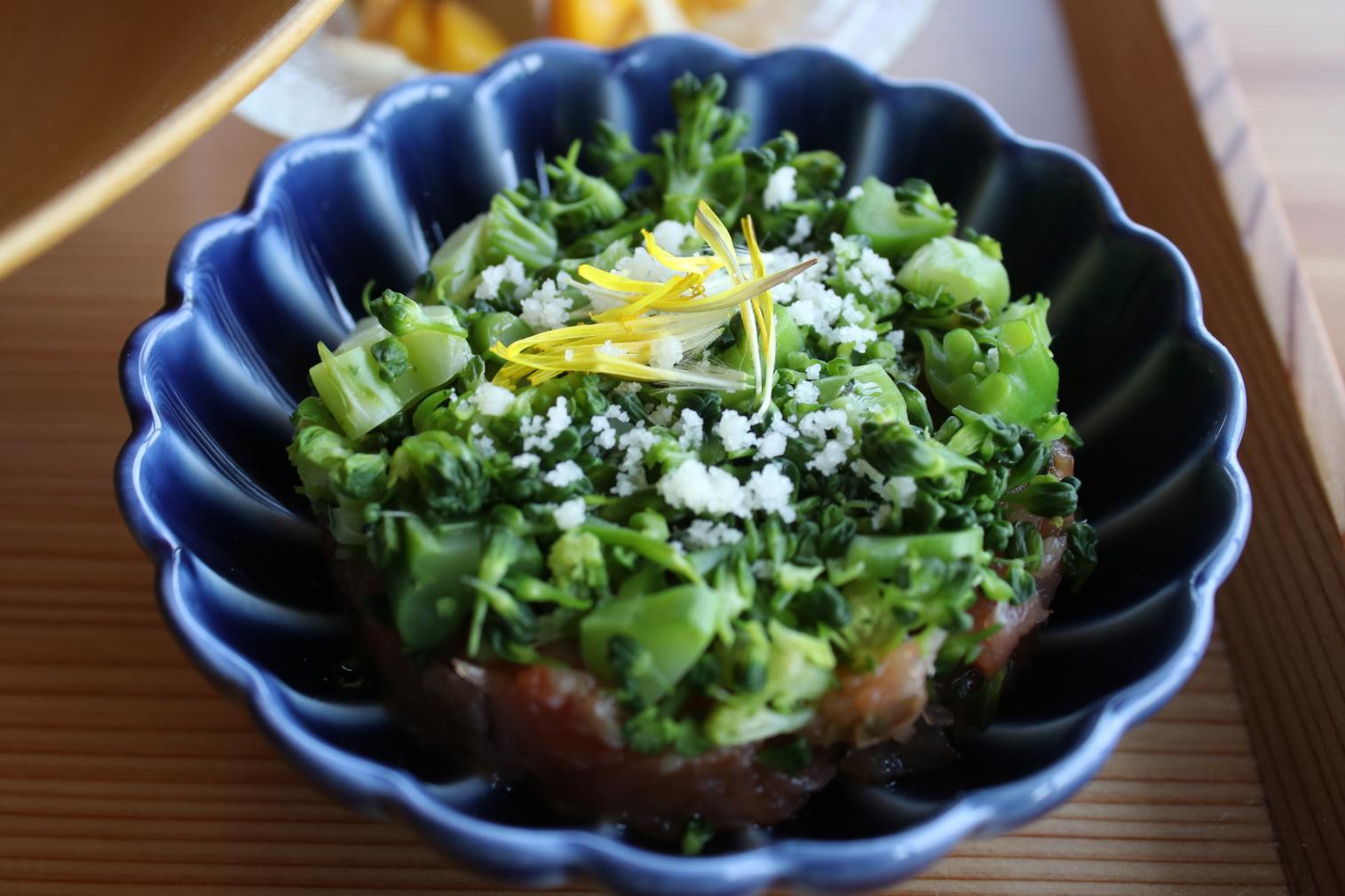 ブロッコリーとパルメザンチーズの下に桜鱒のタルタルがあり、ケーキを思わせる美しい佇まいでした。味は、まさに、富山の海を感じさせるお味。思わず笑顔になる、至福のひと皿でした。