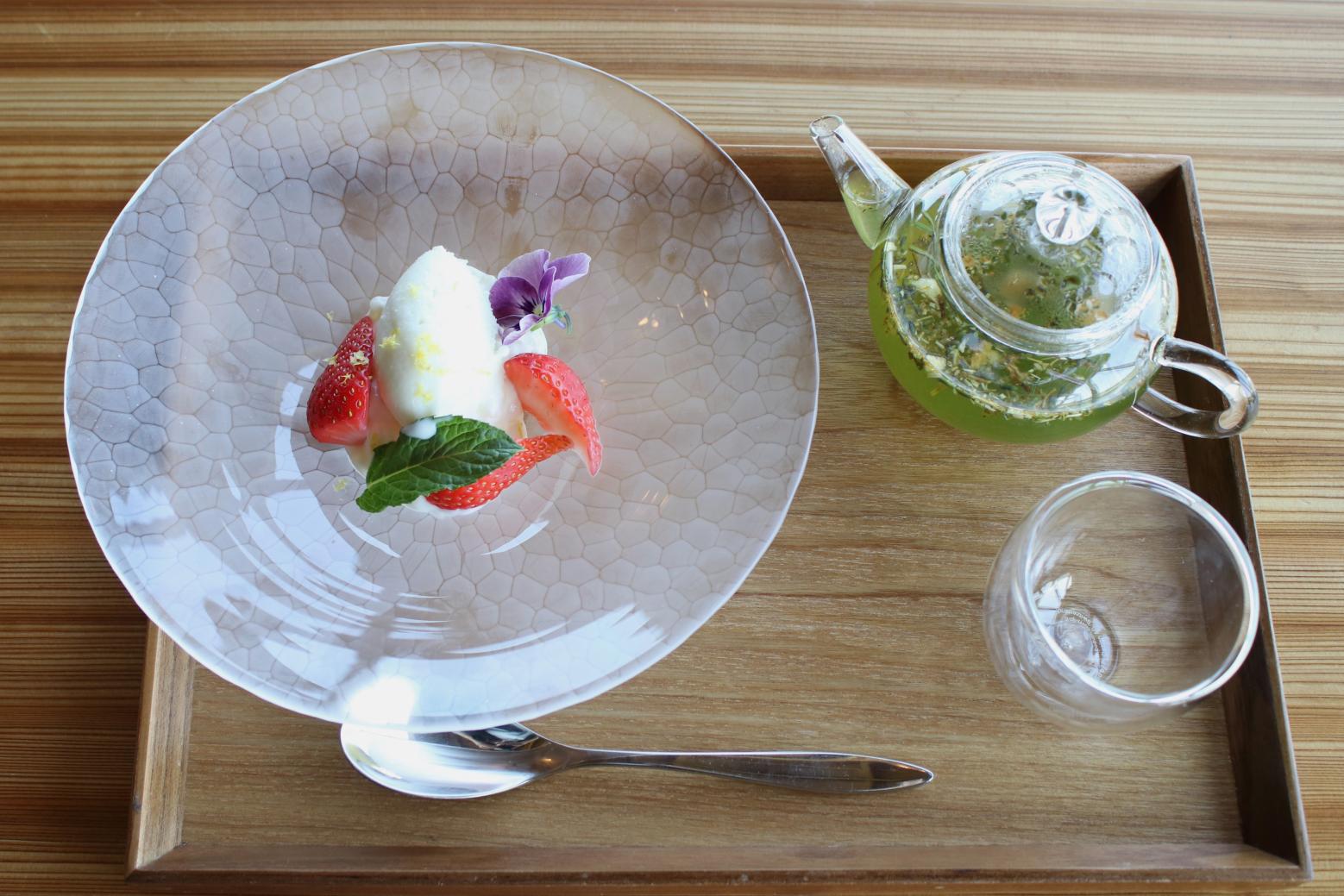 食後には、お米のデザートと、玉ねぎを使ったジェラート、それにハーブティーをいただきました。