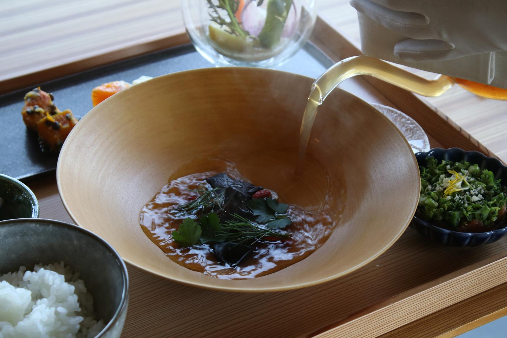 クレンズのあとに、美しい料理がのせられたトレーが、運ばれてきました。真ん中に置かれたスープ皿は具材だけ乗った状態で、後からスープを注ぎに来てくださいます。