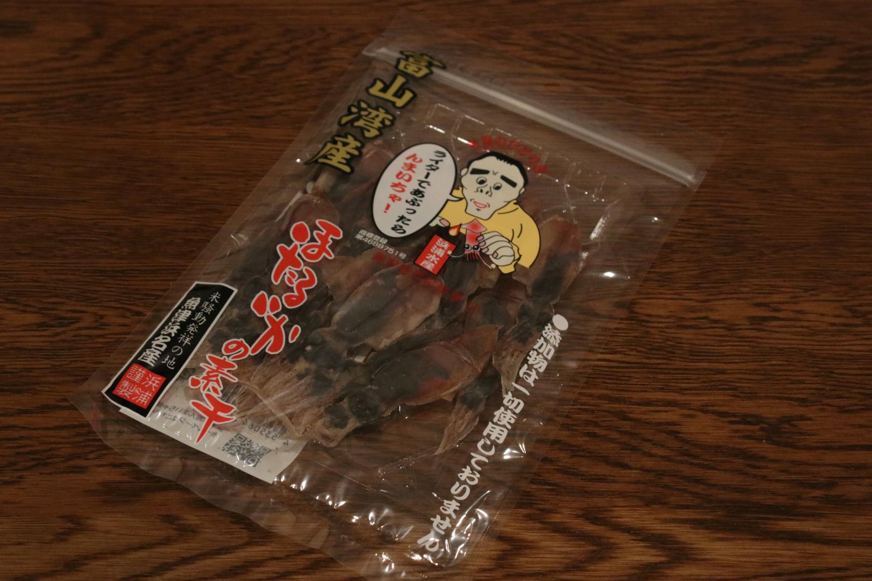 今回、紹介するのは魚津(うおづ)市の浜浦水産が作っている素干しです。パッケージから、かなりインパクトが強いですが、ホタルイカのワタがしっかりと入っていて、風味が強くとてもおいしいです。かみごたえも、かたすぎず柔らかすぎず絶妙なので、私はこのパッケージを見かけるとつい手が伸びて買ってしまいます。添加物は一切使っていないところもポイント。