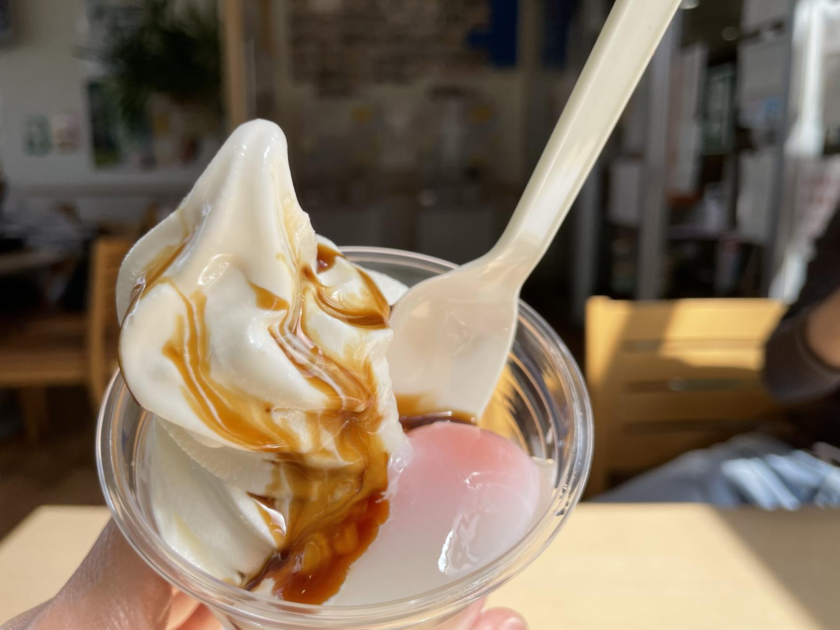 私が訪れた時は、どのフレーバーもおいしそうだったのと、山登りの後でお腹がすいていたという理由で「トリプル」を注文しました。今回は「ミルクティー」「ほうじ茶ラテ」「福光にんじん」を選択。どれも素材の味、良さがしっかりと感じられる味で感動しました。特に「福光にんじん」は、にんじんらしい甘みが生かされていて「これは新しいおいしさと出会ってしまった!」と心の中でつぶやいてしまいました。福光に行くたびに立ち寄りたいお店です。