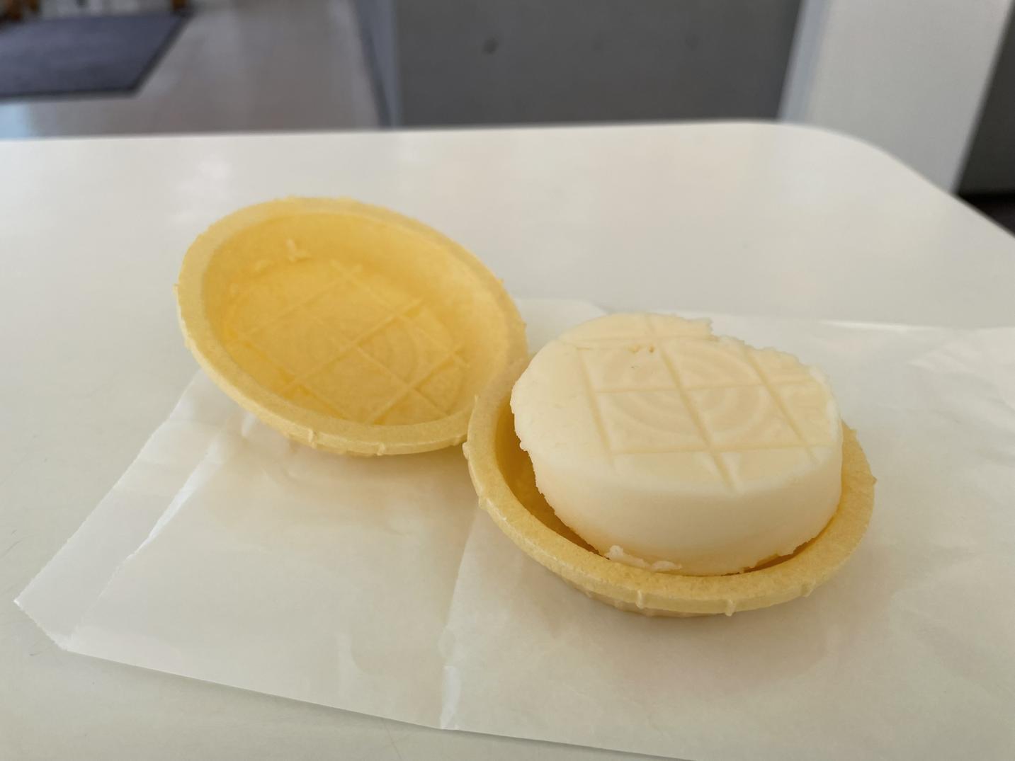 その「ハミングバード」では「自家製クラフトチョコレートアイス」が販売されています。今回は2種類を選択。「ホワイトチョコレートアイス」は、やさしくミルキーな味わいが残る、ホワイトチョコ好きにはたまらないアイス。オーナーいわく「お子さんにもおすすめ」とのことです。
