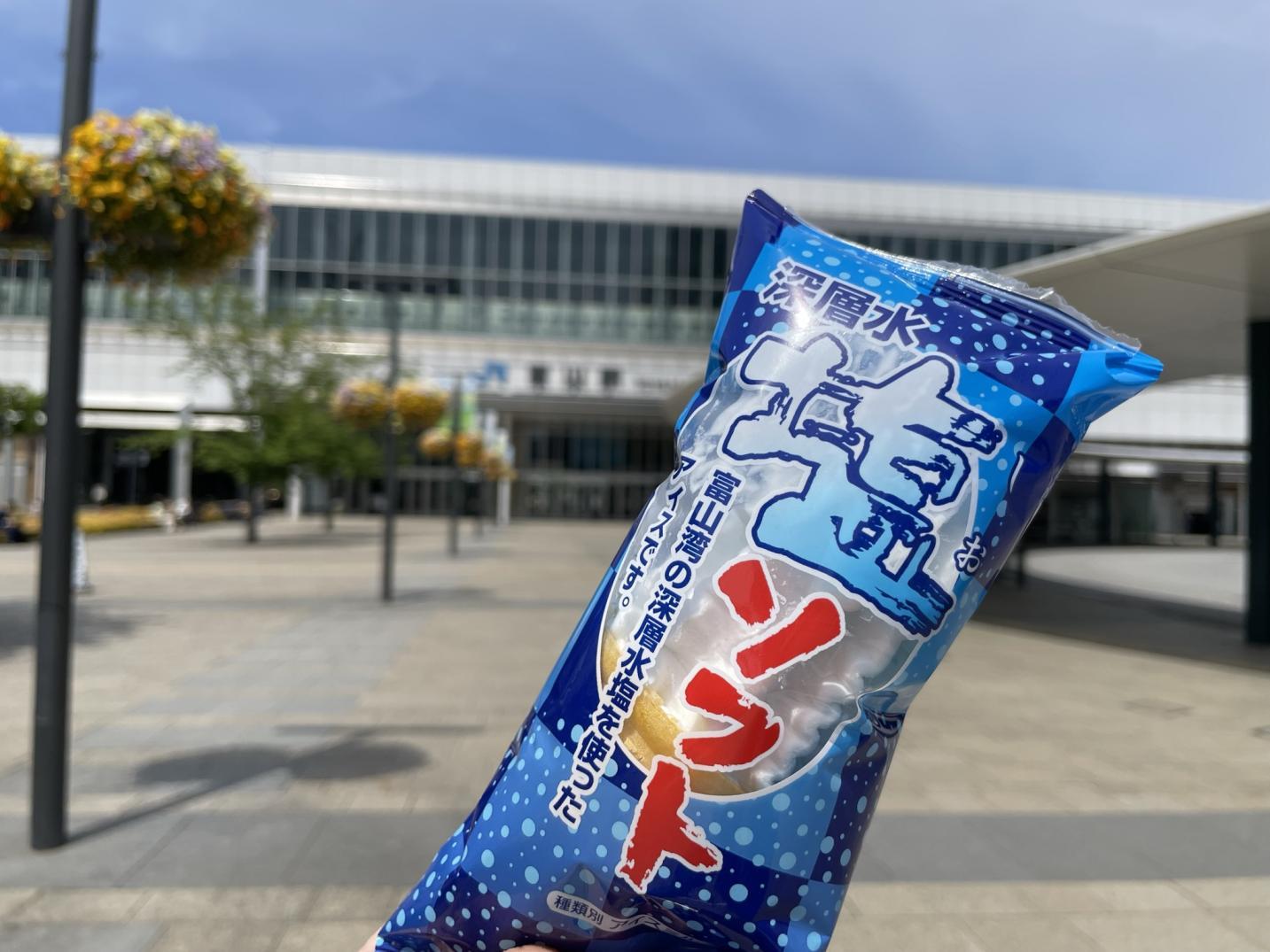 県内のスーパーや観光施設、温泉でよく売られている横山冷菓(黒部市)のアイスも紹介します。富山湾の深層水塩を練りこんだ「塩ソフト」は、バニラ系のアイスに塩が効いていて、熱中症予防にもなりそうな、甘さ控えめのさっぱり系アイスです。見かけたらぜひ食べてみてください!