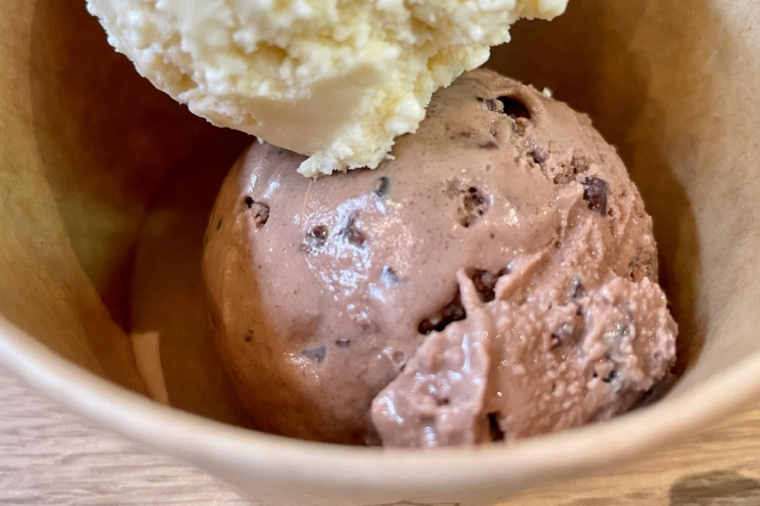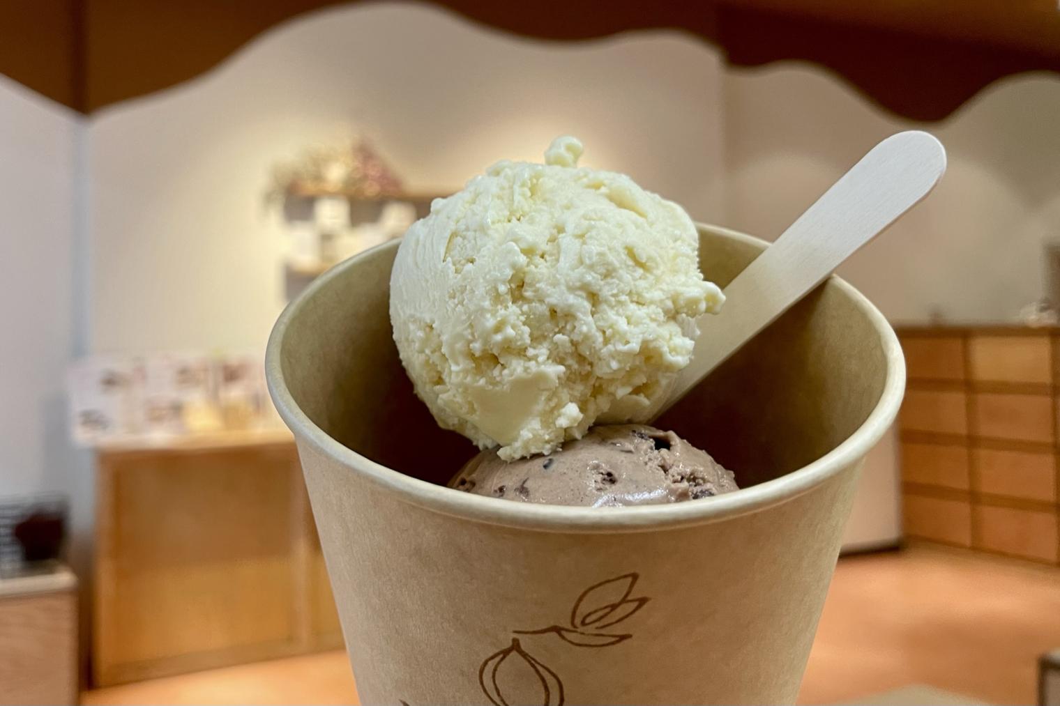 どちらも量がたっぷりでお得です。環境にやさしい紙カップと木のスプーンなのもサステナブルで、ステキだと感じました。アイスができるのを待っている間にチョコレートの試食ができるのも、楽しいです。