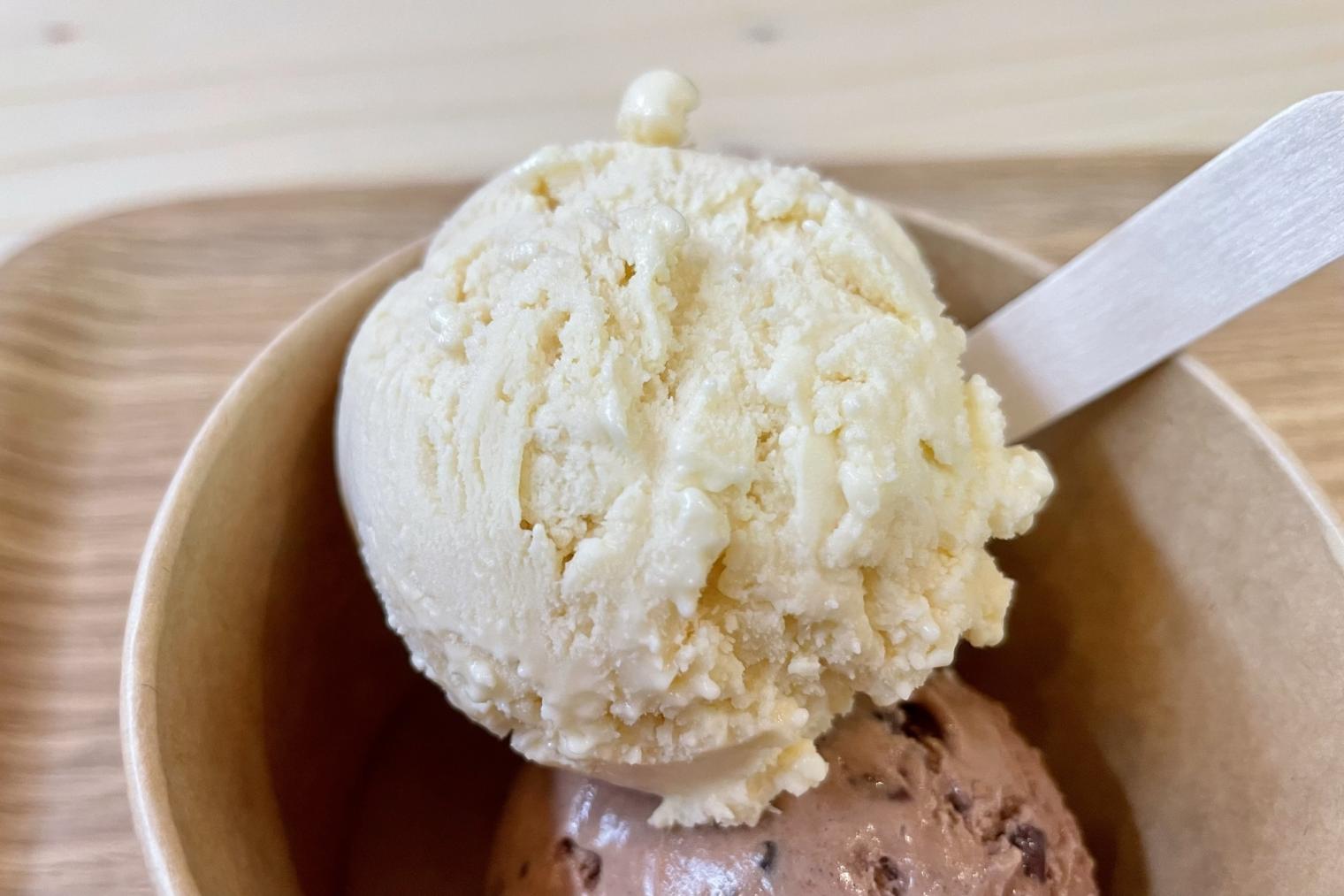 その「ハミングバード」が、この春から「自家製クラフトチョコレートアイス」の販売を始めました。3種類あるうち、今回は2種類を選択。「ホワイトチョコレートアイス」は、やさしくミルキーな味わいが残る、ホワイトチョコ好きにはたまらないアイス。オーナーいわく「お子さんにもおすすめ」とのことです。