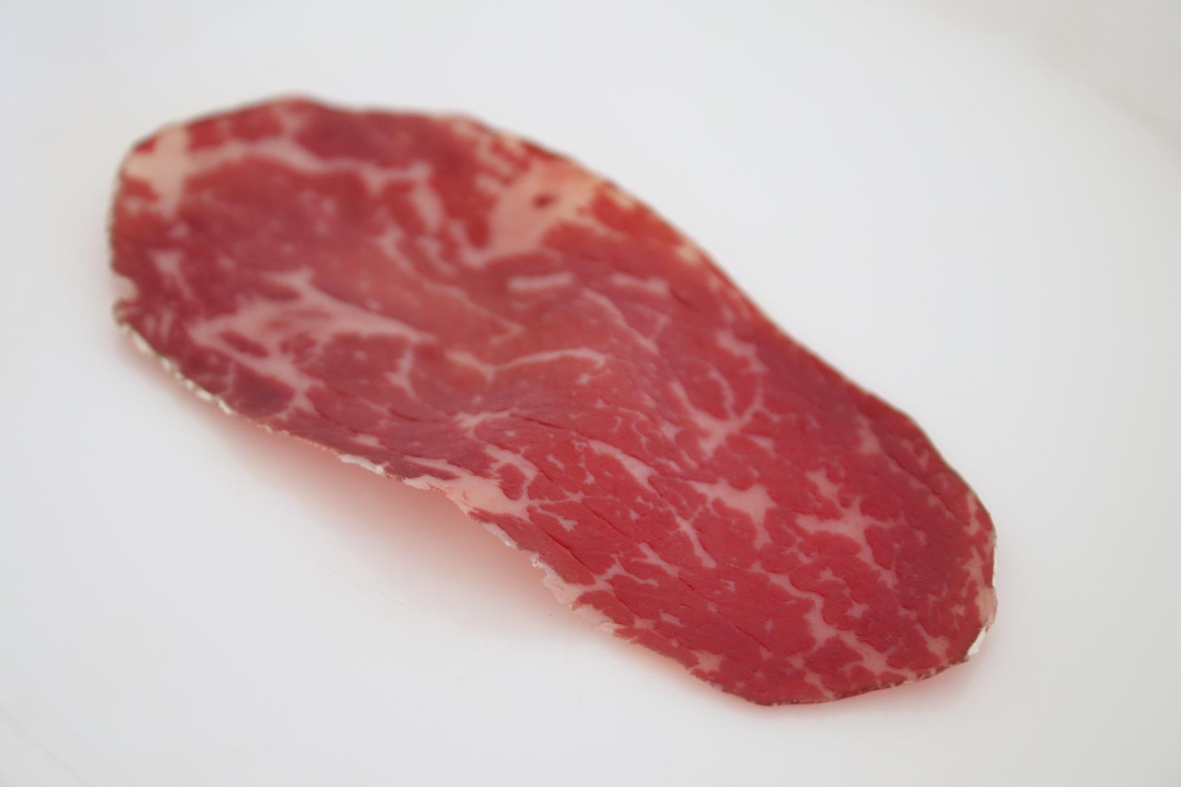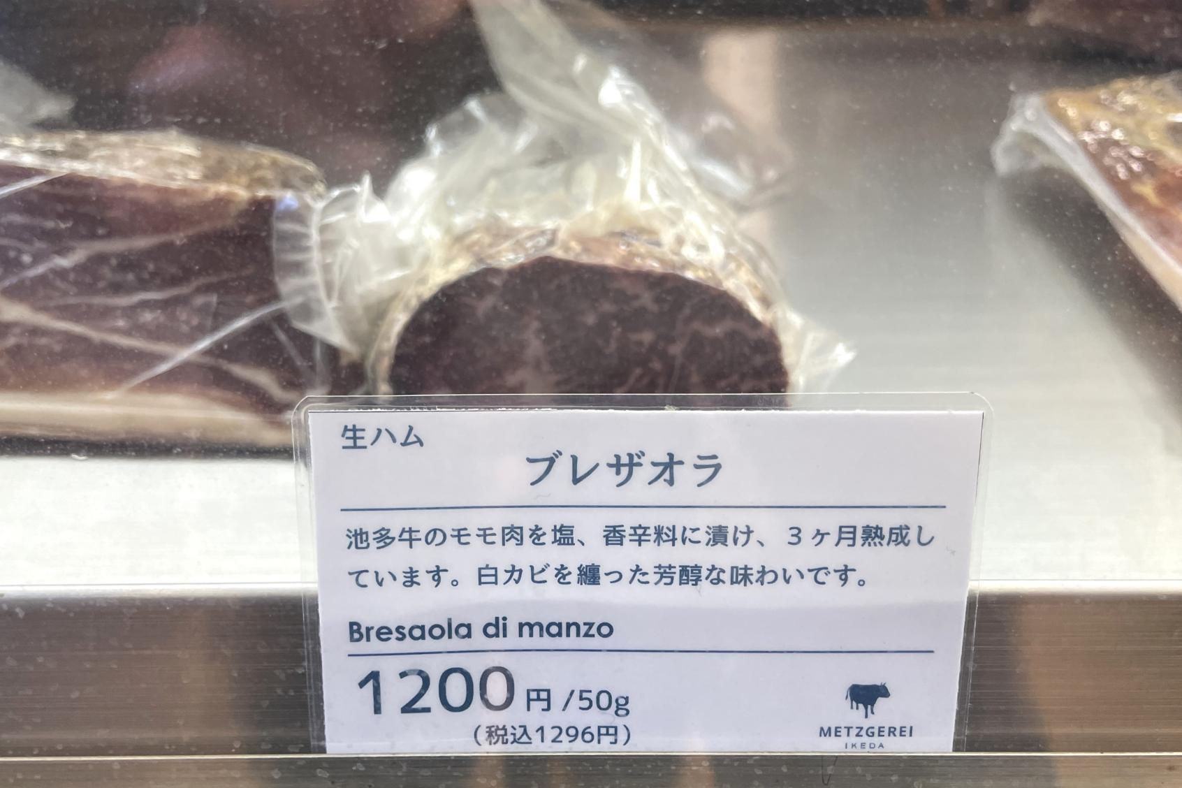 「ブレザオラ」は、池多ファームの牛肉を使った生ハムです。牛肉のうまみがぎゅっと詰まっていて、お酒のお供に最適ですよ!