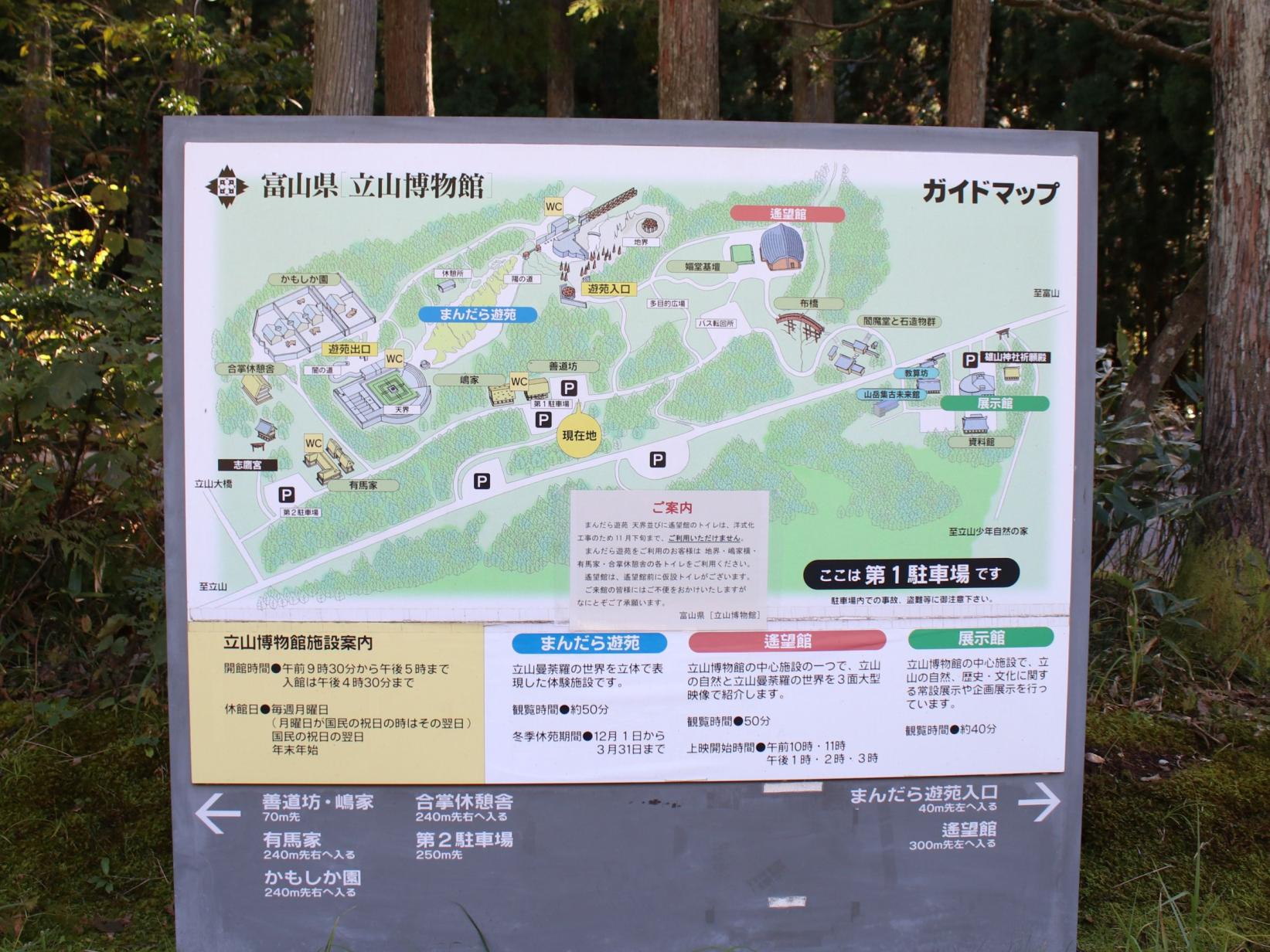 まんだら遊苑へは富山駅から車で約45分、立山駅から約15分(無料駐車場あり)。徒歩の場合は「千垣駅」から徒歩3kmほどです(日曜以外は町営バスあり)。