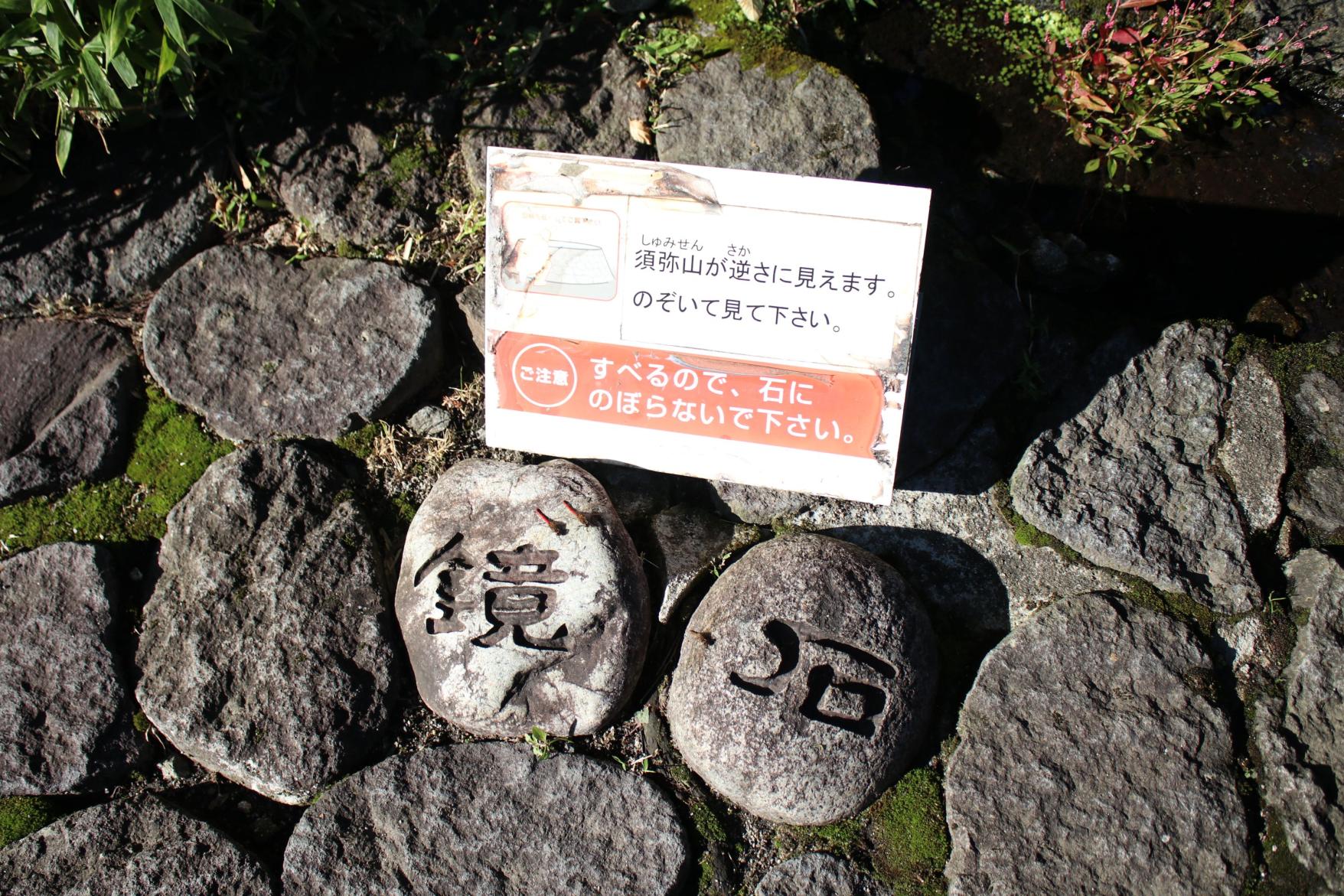 立山の名所が刻まれた石や展示物を回り、15分ほどハイキング気分で歩きました。陽の道の終わりにあるのは「鏡石」。水面に山のモニュメントが写る、人気撮影スポットです。