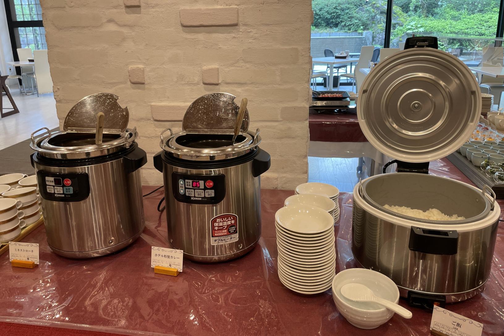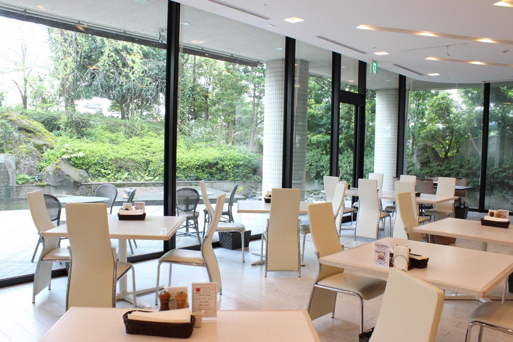 レストランがあるのは、「ホテルグランミラージュ」1階の奥。テーブルとテーブルの間が広く、動きやすい配置になっていました。全面ガラス張りの窓からガーデンを見渡せて、気持ちよく、ビュッフェのスペースも広々としていて、とりやすかったです。