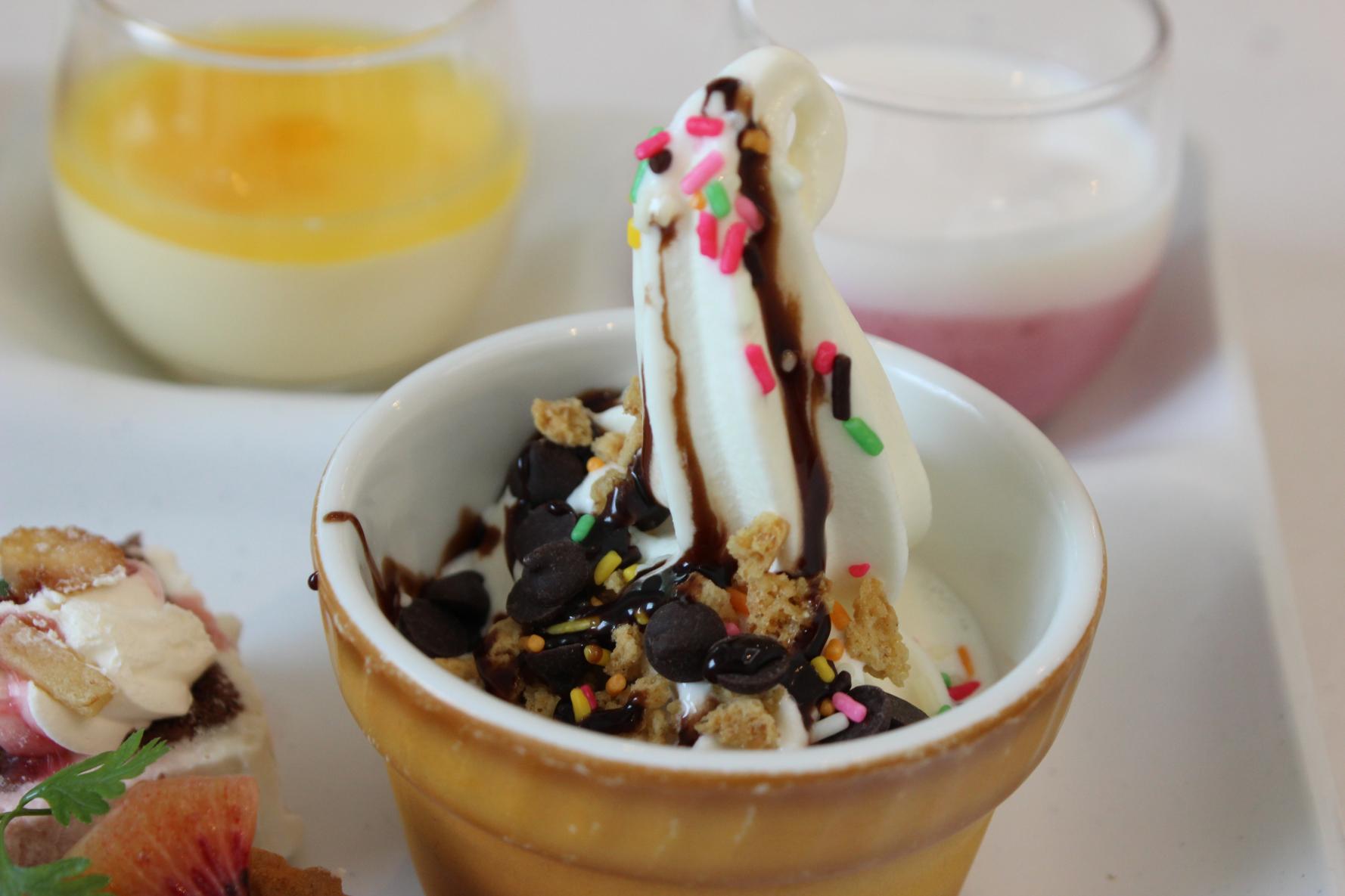 ソフトクリームは食べ放題になっていて、ソースやコーンフレークなどのトッピングを自由にかけられました。なお、ソフトクリームは2024年6月からアイスクリームに変更される予定です。