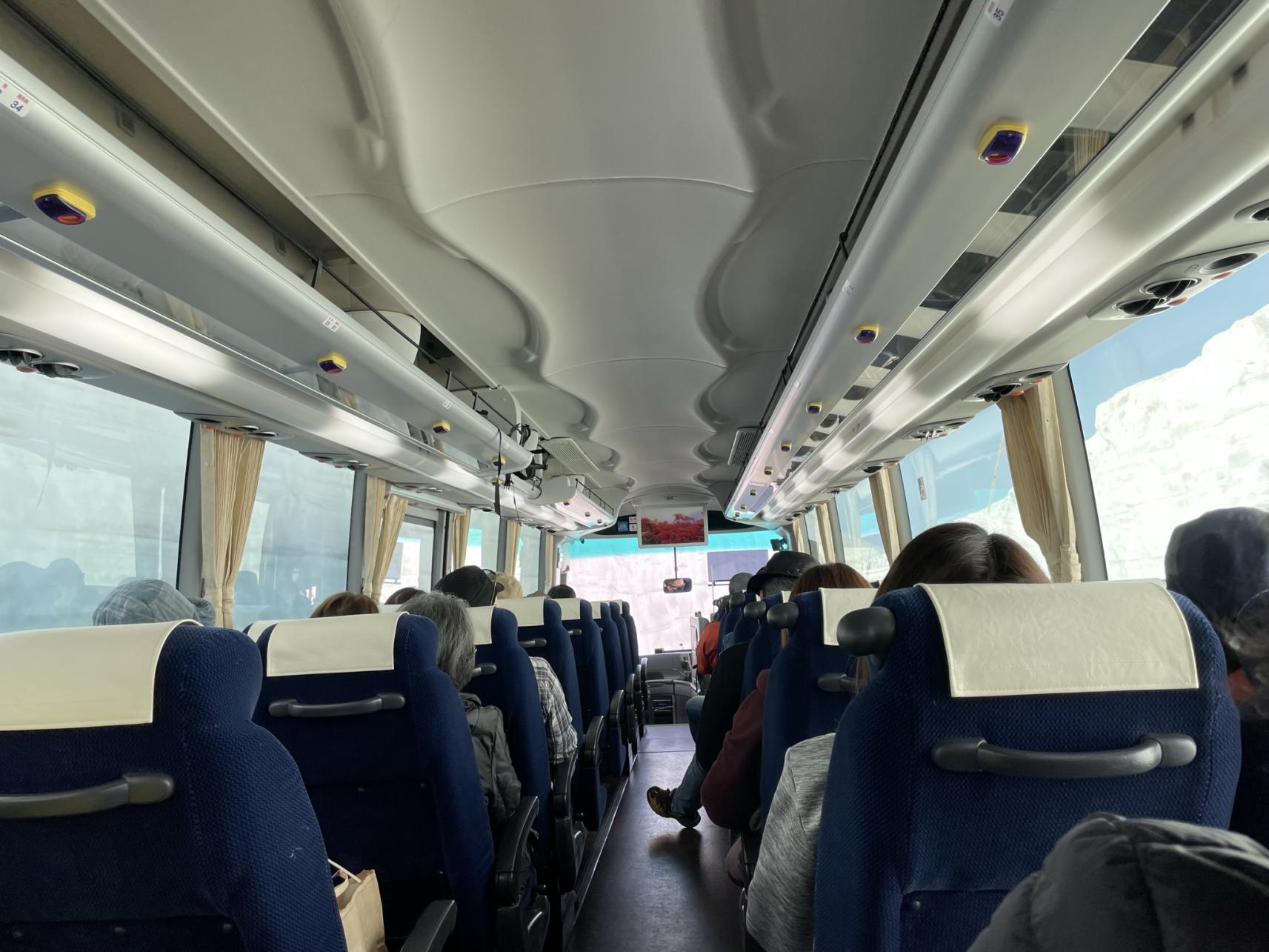 美女平駅からは、そのままバスへ。ほとんどの人が、ケーブルカーを降りてすぐに、改札から徒歩1分ほどのバス乗り場に向かっていくので、流れについていけば問題ないです。