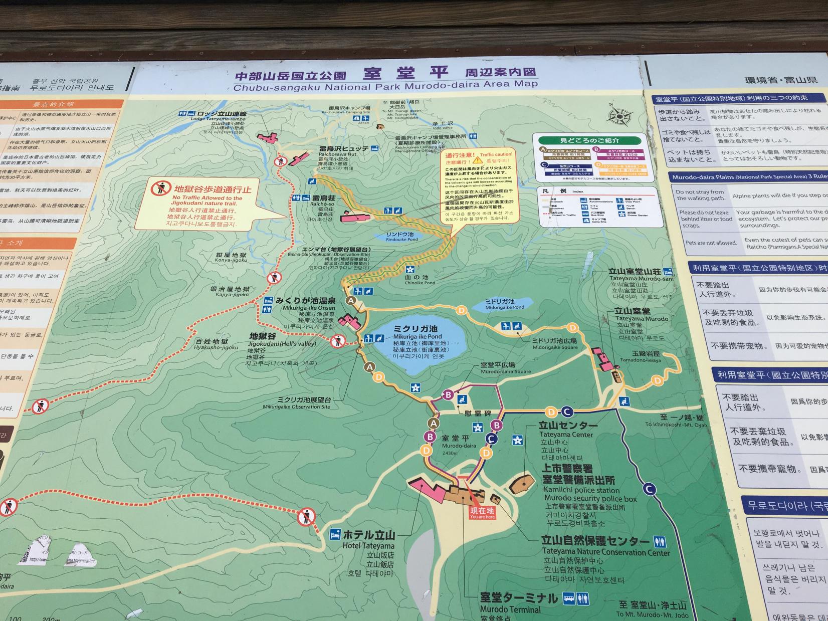 室堂についたら、まずは階段を上り、外へ出て地図をチェックしましょう。おすすめは、舗装されている道を1時間ほどかけてのんびり歩く「みくりが池・エンマ台(上記地図のA)」コース。私は、室堂に到着してから、上記の地図をスマートフォンで撮って、確認しながら歩きました。