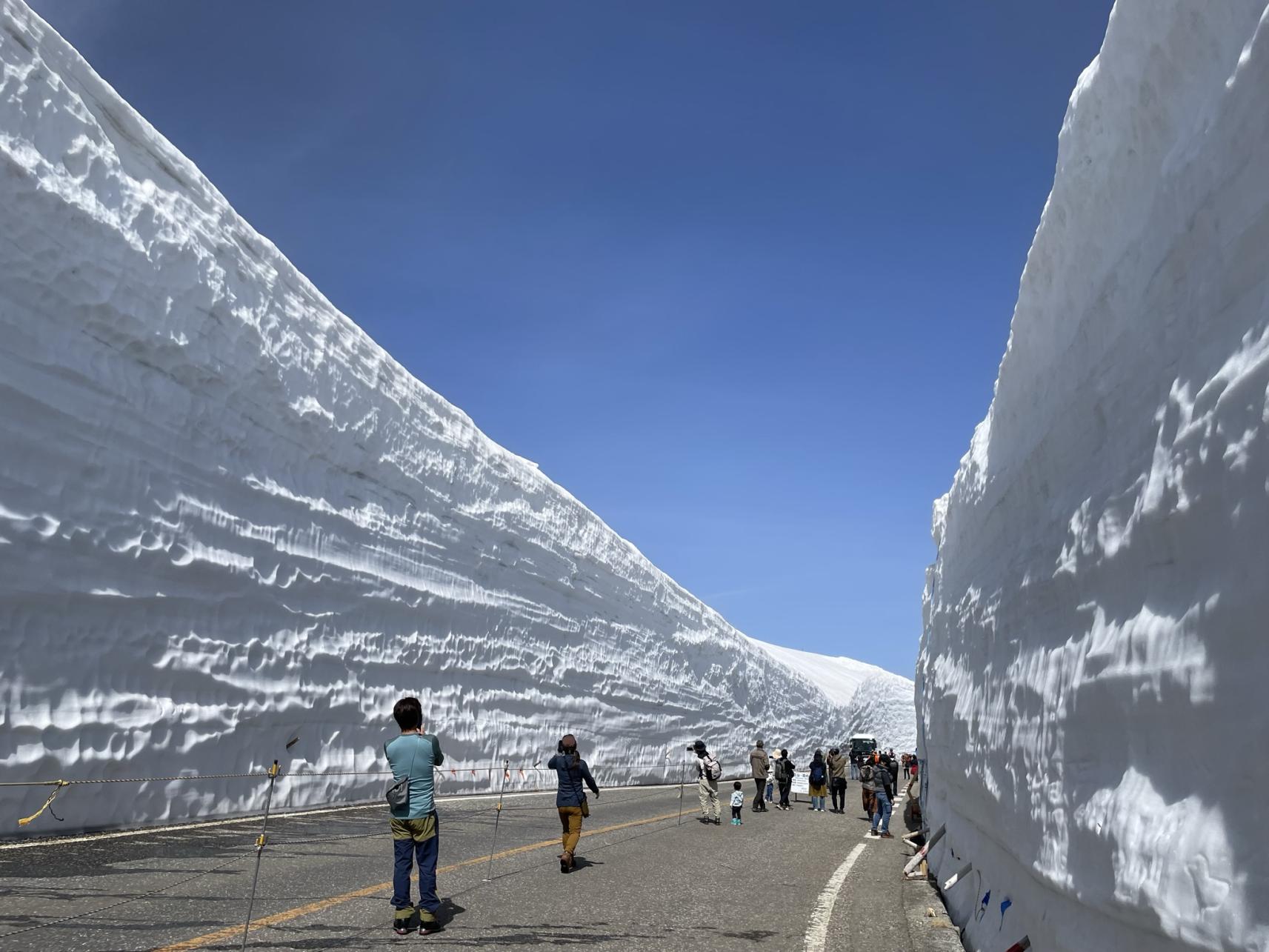 4月~6月は、室堂から徒歩で行ける「雪の大谷」へ行くのがおすすめ。「雪の大谷」の見学コースは人が多いので、1人で行っても不安なく楽しめます。雪の上を歩くこともあるので防水の効いたトレッキングシューズや長靴、スノーブーツを持っていく、または履いていくと良いでしょう。なお、「雪の大谷」開催時期は、みくりが池などをめぐる散策道は雪に覆われているので、ご注意ください。
