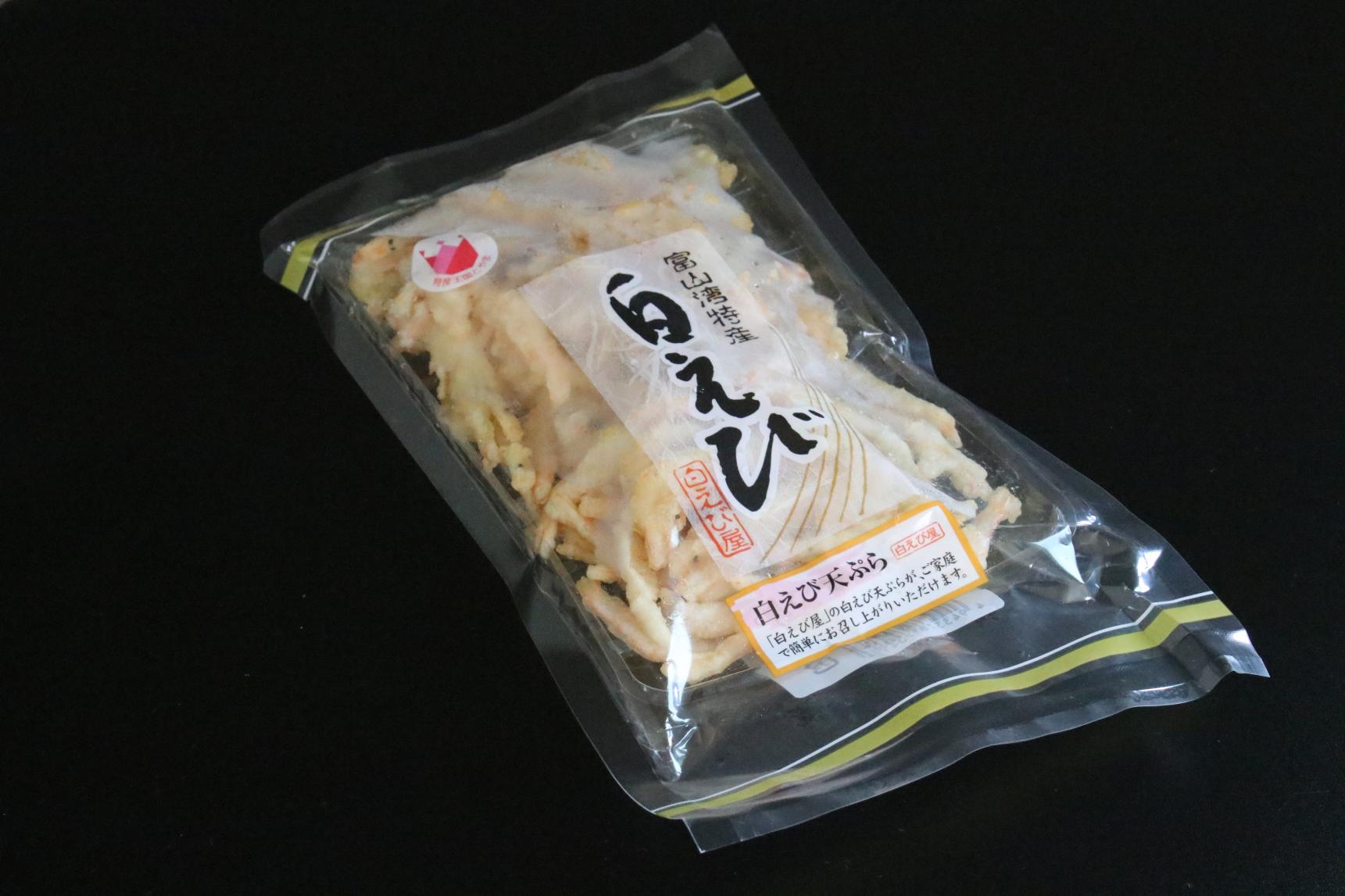「きときと市場とやマルシェ」に入ってすぐの場所にある、行列が絶えない「白えび亭」の名物である「白えび天ぷら」の冷凍パックです。解凍後、熱したフライパンで20~30秒ほどから煎りするだけで、香ばしい天ぷらをいただけます。