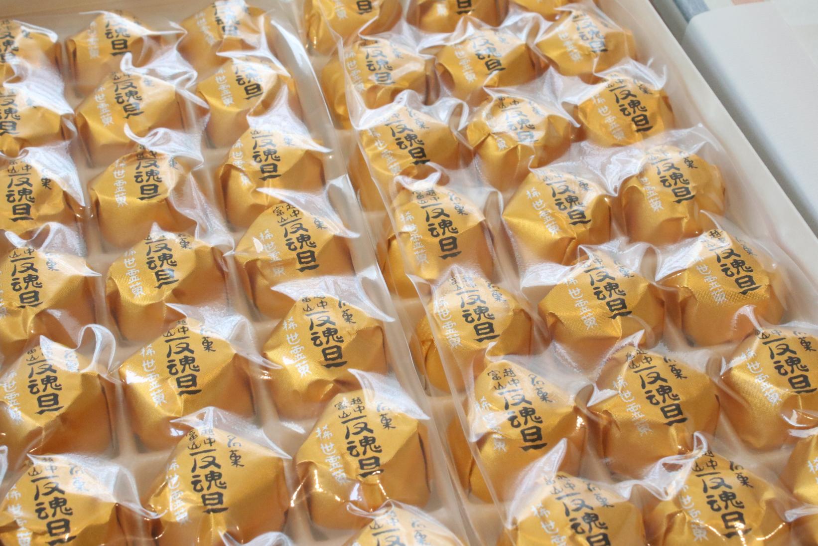 とやまの薬として有名な腹痛に効くと言われる「反魂旦(はんごんたん)」を模して作られた焼きまんじゅうです。1964年に内閣総理大臣賞を受賞しており、お土産の定番として人気を博しています。