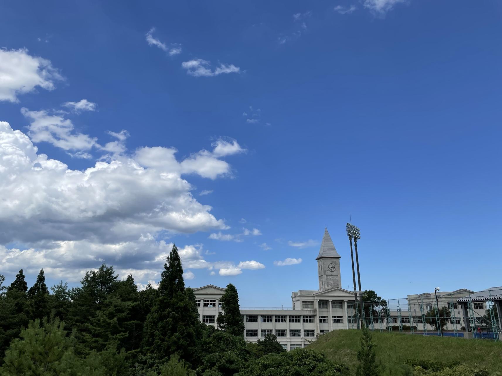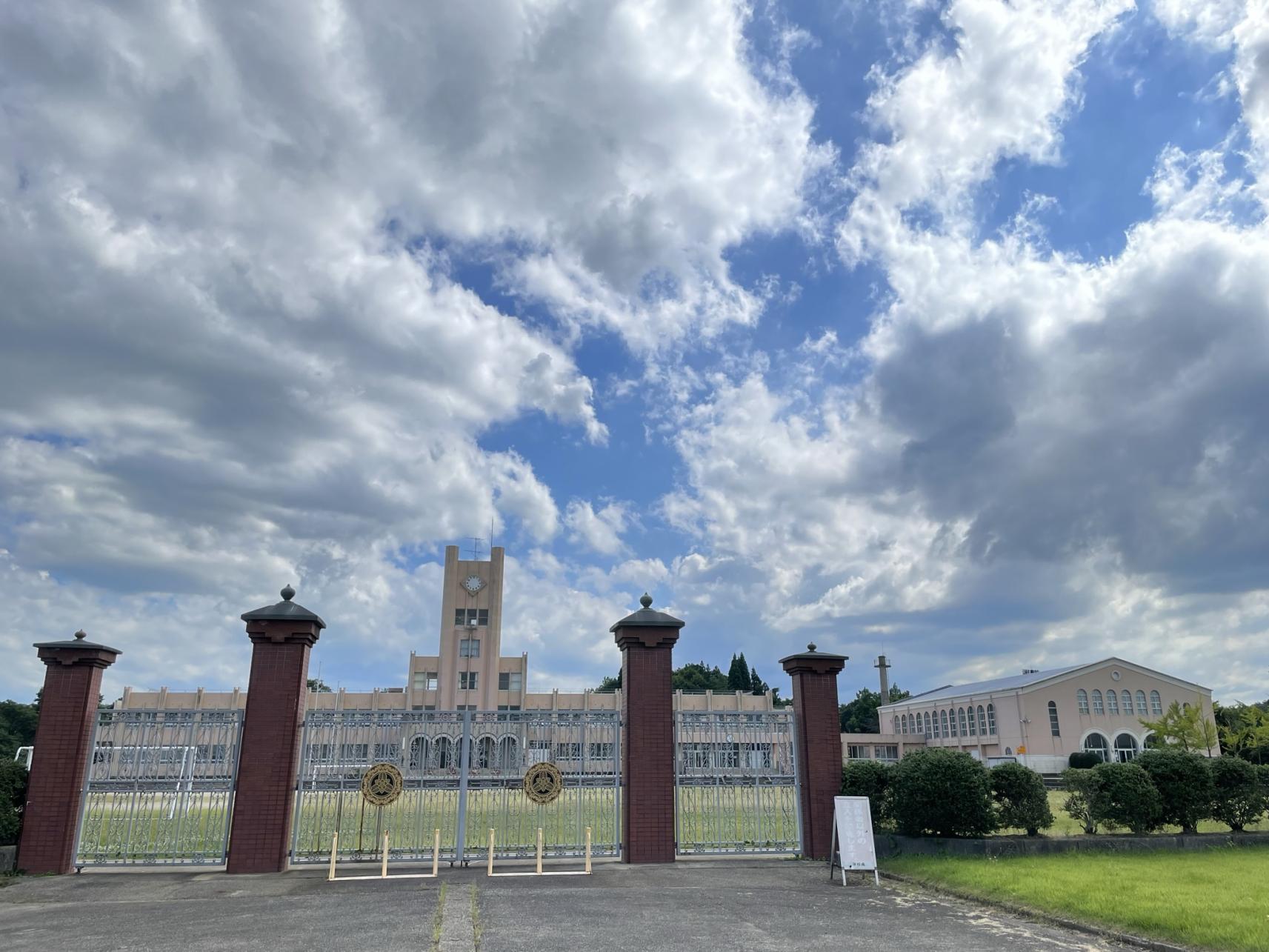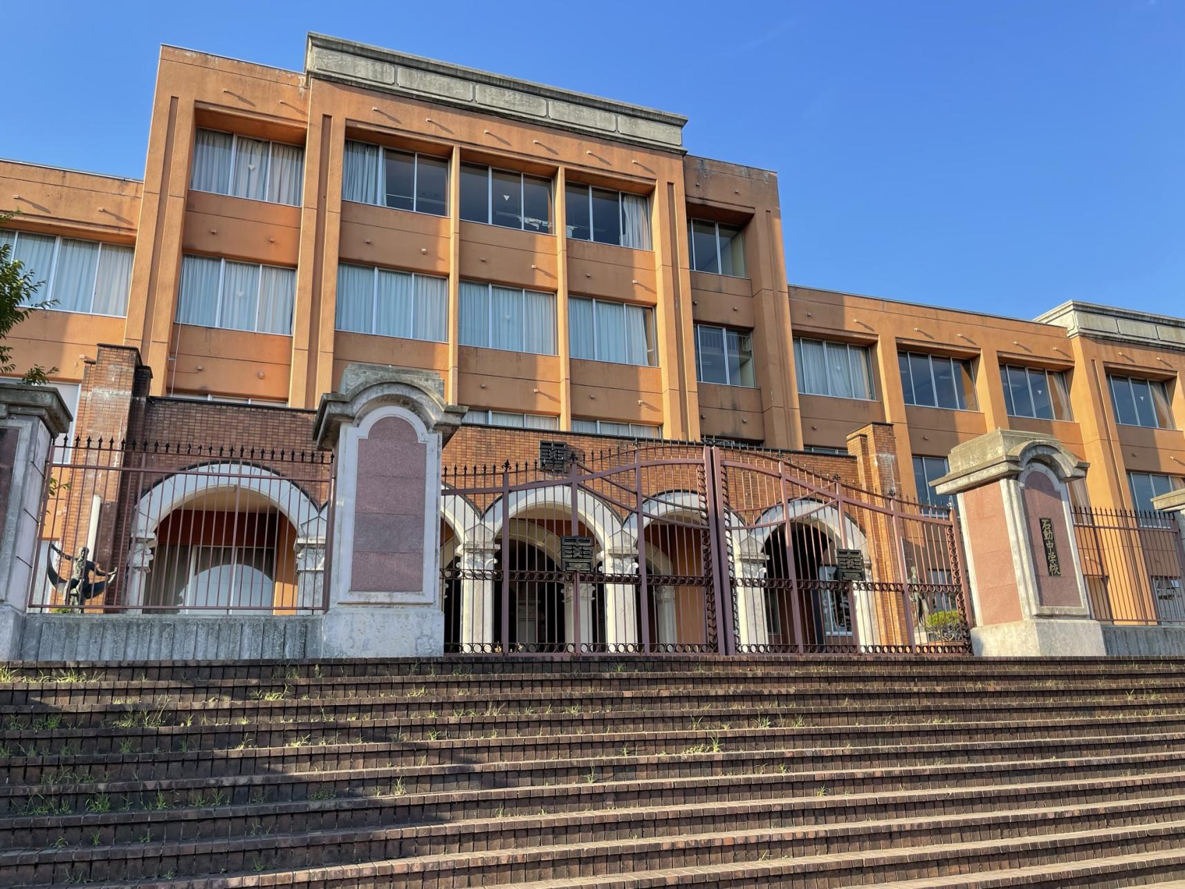 小高い丘の上にある蟹谷(かんだ)中学校は高さ42メートルの中央の尖塔がオックスフォード大学、校舎中央はベルサイユ宮殿をイメージしている、とのことです。門が立派で、風格が漂っています。