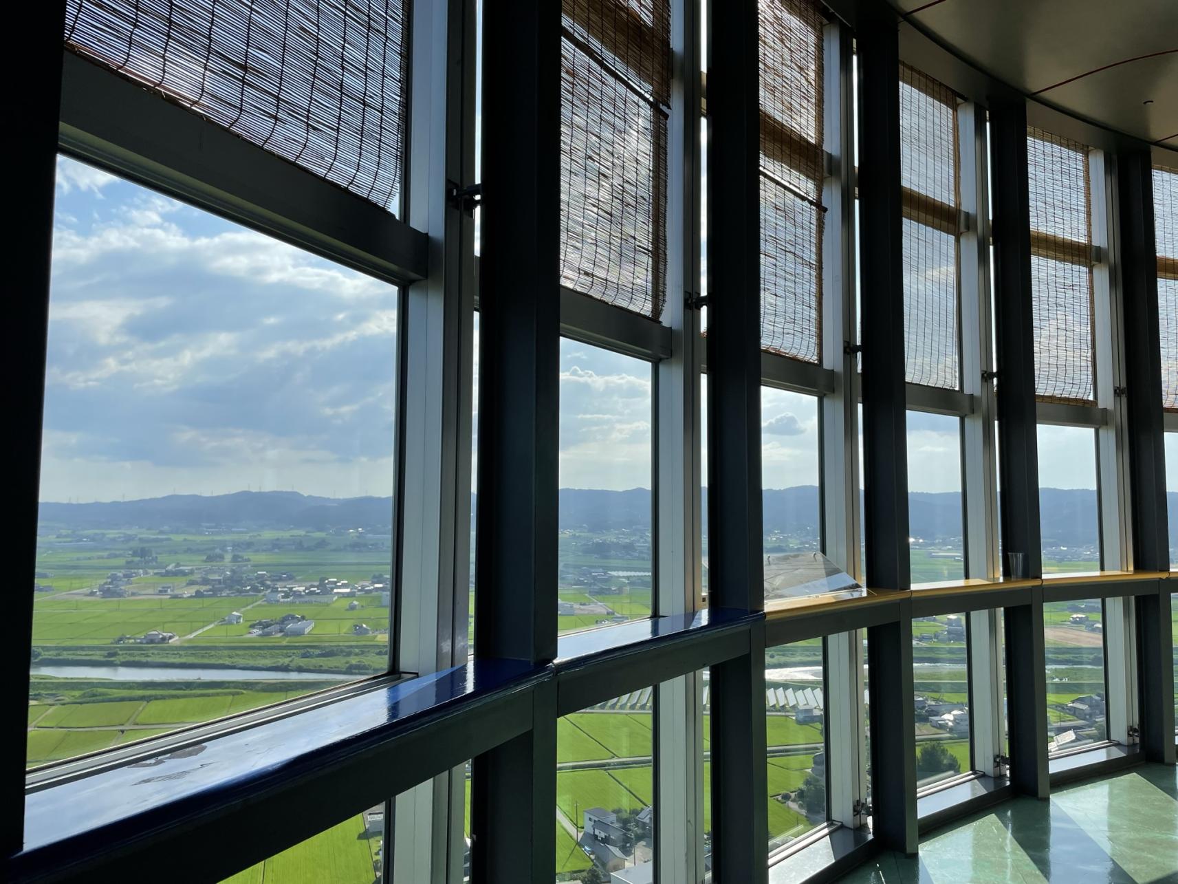 最高部118mのクロスランドタワーにも足を運んでみてください。地上100mに展望フロアを備えており、メルヘン建築を確認できます。また、都会のタワーと異なり、眼下には田園風景が広がり、遠くには雄大な山々が見えます。緑いっぱいの風景に癒されますよ。