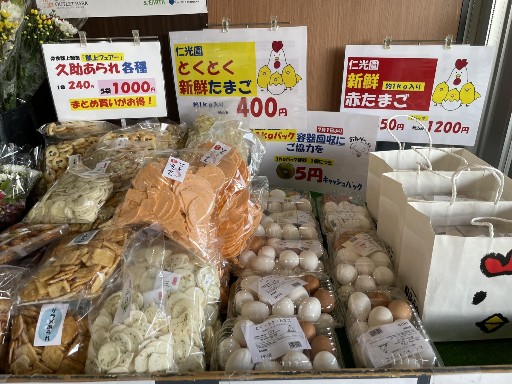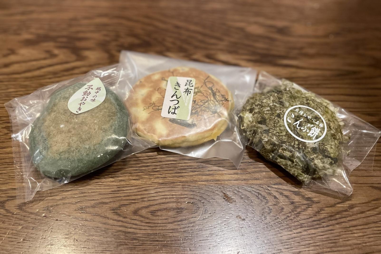 おやべ名物として人気の「こんぶ餅」は文字通り、昆布がまぶしてあるお餅なのですが、甘くないので、小腹が空いたときの軽食にもおすすめです。昆布のうまみが絶妙で、行くたびに買いたくなる一品です。農産物は新鮮でおいしいものばかりでした!
